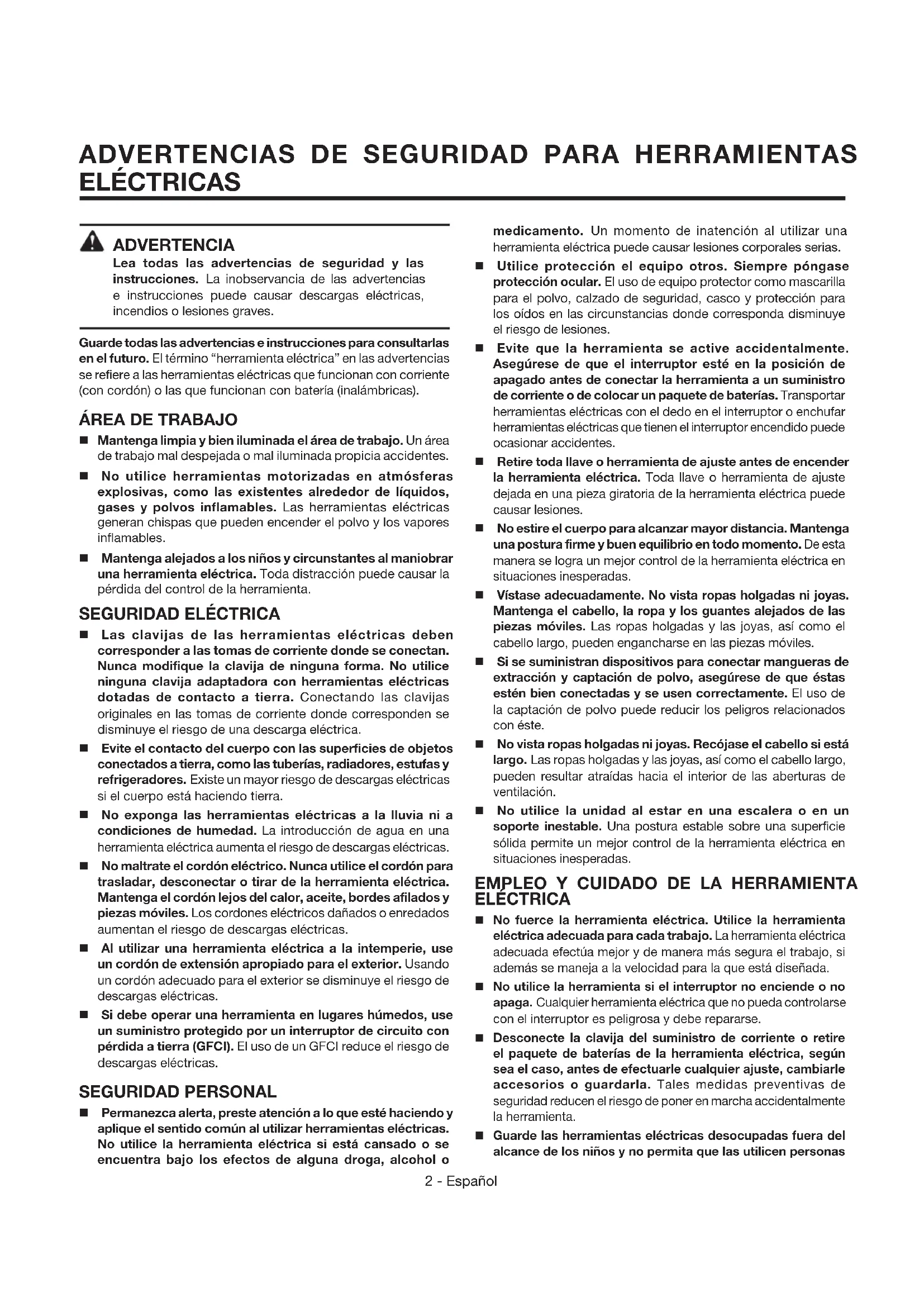 ELÉCTRICAS3 - Español no familiarizadas con las mismas o con estas instrucciones. Las herramientas eléctricas son peligrosas en manos de personas no capacitadas en el uso de las mismas.