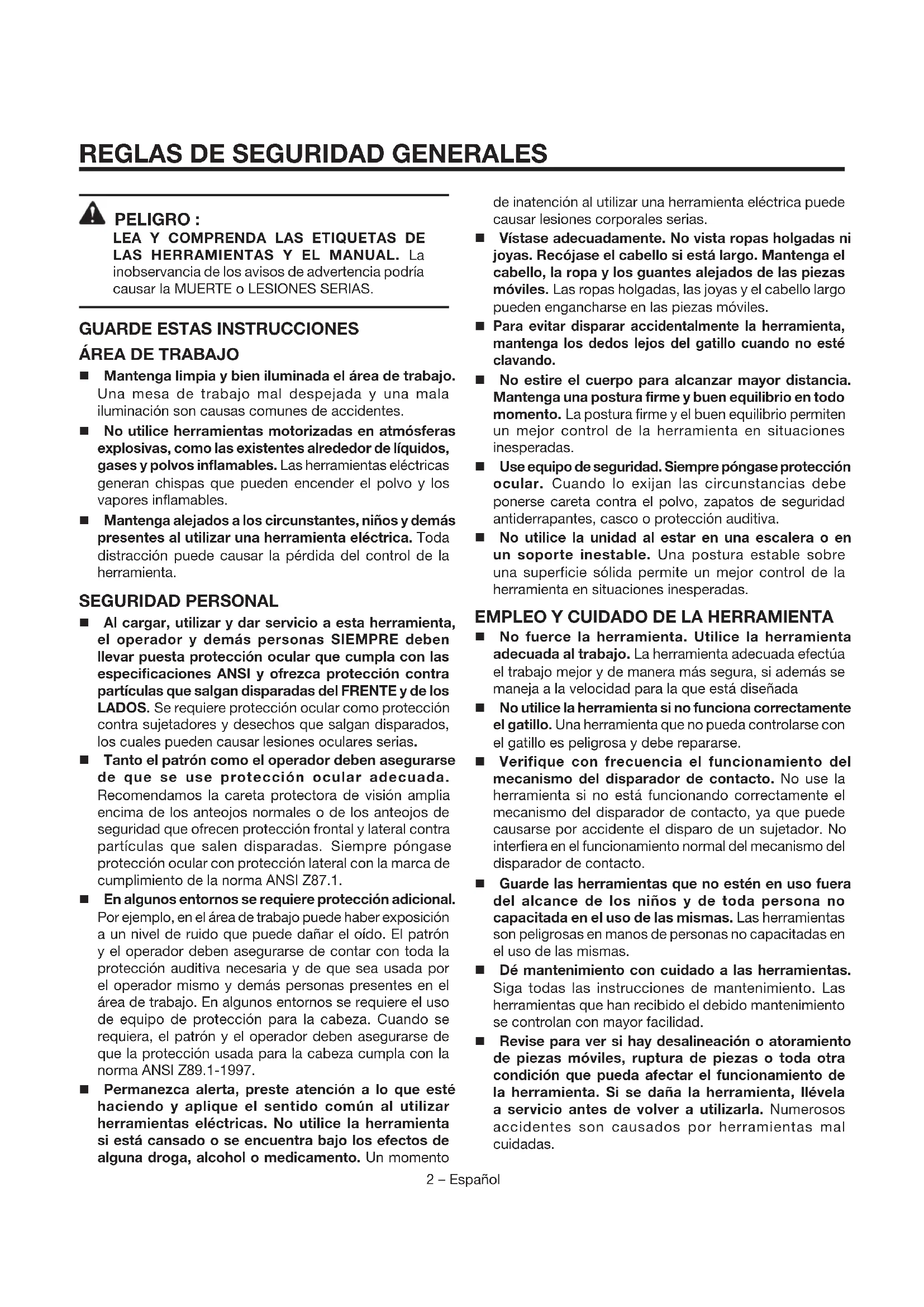 No fuerce la herramienta. Utilice la herramienta adecuada al trabajo. La herramienta adecuada efectúa el trabajo mejor y de manera más segura, si además se maneja a la velocidad para la que está diseñada No utilice la herramienta si no funciona correctamente el gatillo. Una herramienta que no pueda controlarse con el gatillo es peligrosa y debe repararse. Verifique con frecuencia el funcionamiento del mecanismo del disparador de contacto. No use la herramienta si no está funcionando correctamente el mecanismo del disparador de contacto, ya que puede causarse por accidente el disparo de un sujetador. No interfiera en el funcionamiento normal del mecanismo del disparador de contacto. Guarde las herramientas que no estén en uso fuera del alcance de los niños y de toda persona no capacitada en el uso de las mismas. Las herramientas son peligrosas en manos de personas no capacitadas en el uso de las mismas. Dé mantenimiento con cuidado a las herramientas. Siga todas las instrucciones de mantenimiento. Las herramientas que han recibido el debido mantenimiento se controlan con mayor facilidad. Revise para ver si hay desalineación o atoramiento de piezas móviles, ruptura de piezas o toda otra condición que pueda afectar el funcionamiento de la herramienta. Si se daña la herramienta, llévela a servicio antes de volver a utilizarla. Numerosos accidentes son causados por herramientas mal cuidadas.3 – Español Familiarícese con su herramienta neumática . Lea cuidadosamente el manual del operador. Aprenda sus usos y limitaciones, así como los posibles peligros específicos de esta herramienta. Con el cumplimiento de esta regla se reduce el riesgo de una descarga eléctrica, incendio o lesión seria. Siempre póngase protección ocular con protección lateral con la marca de cumplimiento de la norma ANSI Z87.1. Si no cumple esta advertencia, los objetos que salen despedidos pueden producirle lesiones serias en los ojos. Protéjase los pulmones. Use una careta o mascarilla contra el polvo si la operación genera mucho polvo. Con el cumplimiento de esta regla se reduce el riesgo de lesiones corporales serias. Protéjase los oídos. Durante períodos prolongados de utilización de la unidad póngase protección para los oídos. Con el cumplimiento de esta regla se reduce el riesgo de lesiones corporales serias. Asegúrese de que la manguera no esté obstruida ni enganchada. Si la manguera se enreda o engancha puede causar una pérdida del equilibrio o postura y puede dañarse. Solamente utilice esta herramienta para el propósito especificado. No dispare clavos al aire. Use la herramienta neumática solamente para el propósito para la que fue diseñada. Solamente utilice los sujetadores recomendados para esta herramienta. El uso de los sujetadores incorrectos podría hacer que los sujetadores no avancen bien, que se atoren y que los sujetadores no salgan de la herramienta siempre al mismo ángulo. Si los sujetadores no avanzan de manera uniforme y correcta, interrumpa su uso de inmediato. Los sujetadores atorados que avanzan de manera incorrecta pueden provocar lesiones serias. Nunca utilice esta herramienta de ninguna forma que pueda dirigir un sujetador (clavo o grapa, según sea el caso) hacia ninguna otra cosa que no sea la pieza de trabajo. No use la herramienta como martillo.