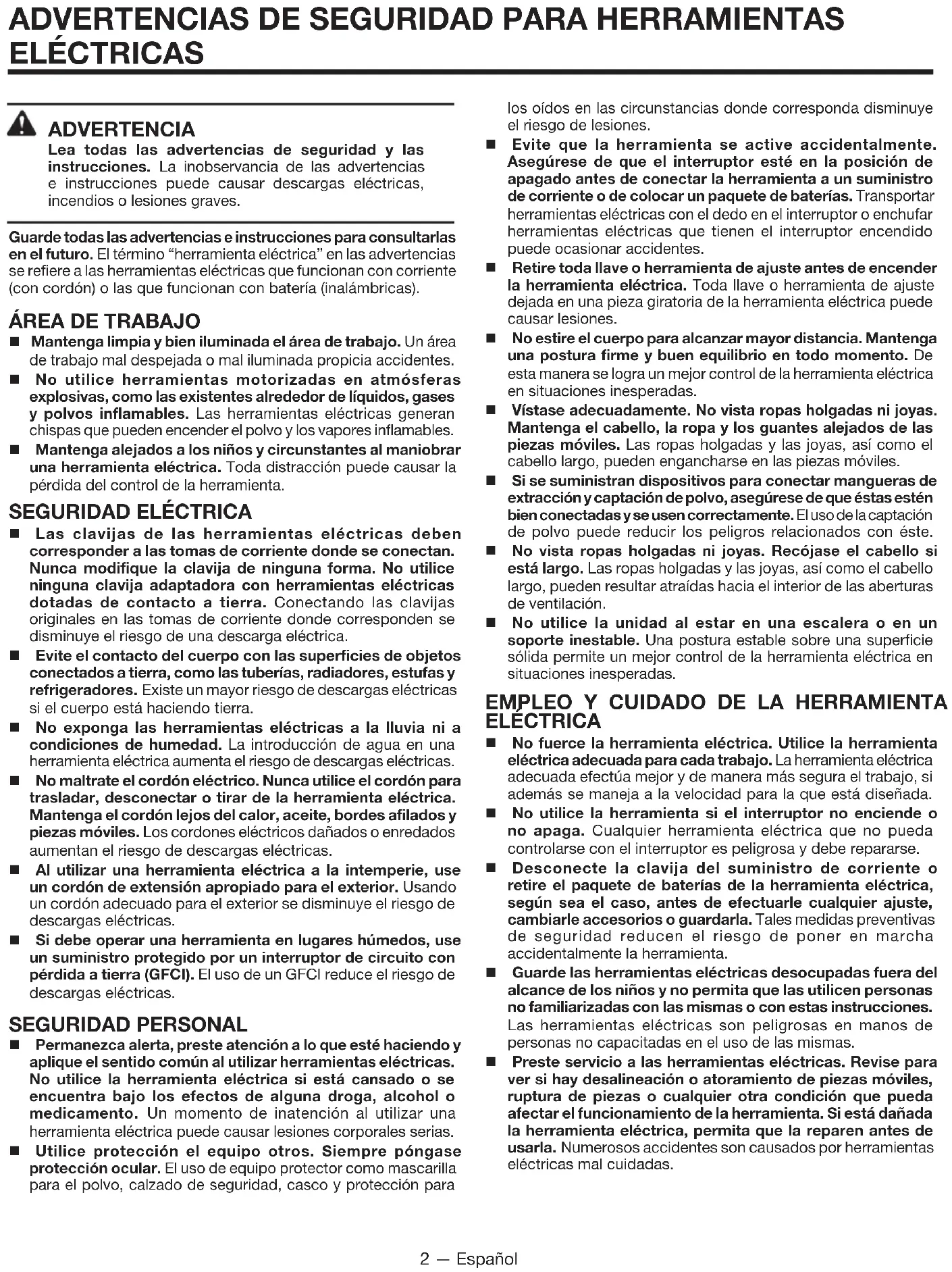 ELÉCTRICAS ADVERTENCIA Lea todas las advertencias de seguridad y las instrucciones. La inobservancia de las advertencias e instrucciones puede causar descargas eléctricas, incendios o lesiones graves. Guarde todas las advertencias e instrucciones para consultarlas en el futuro. El término “herramienta eléctrica” en las advertencias se refiere a las herramientas eléctricas que funcionan con corriente (con cordón) o las que funcionan con batería (inalámbricas).