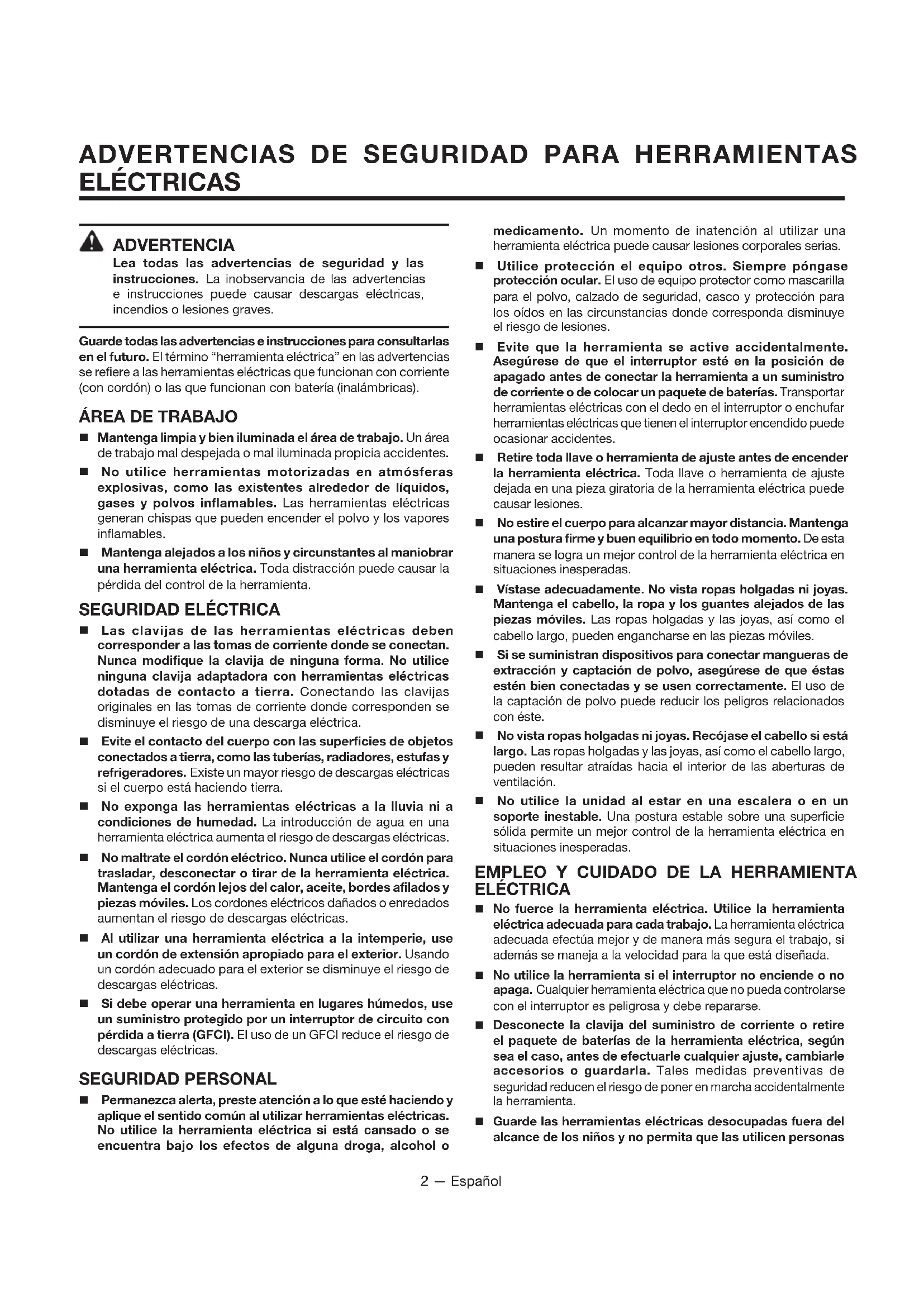 ELÉCTRICAS3 — Español no familiarizadas con las mismas o con estas instrucciones. Las herramientas eléctricas son peligrosas en manos de personas no capacitadas en el uso de las mismas.