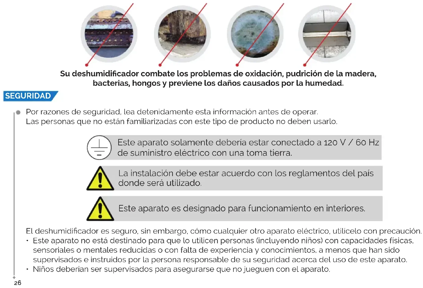 - Niños deberían ser supervisados para asegurarse que no jueguen con el aparato. La instalación debe estar acuerdo con los reglamentos del país donde será utilizado. Este aparato es designado para funcionamiento en interiores. Este aparato solamente debería estar conectado a 120 V / 60 Hz de suministro eléctrico con una toma tierra. Su deshumidicador combate los problemas de oxidación, pudrición de la madera, bacterias, hongos y previene los daños causados por la humedad. +27