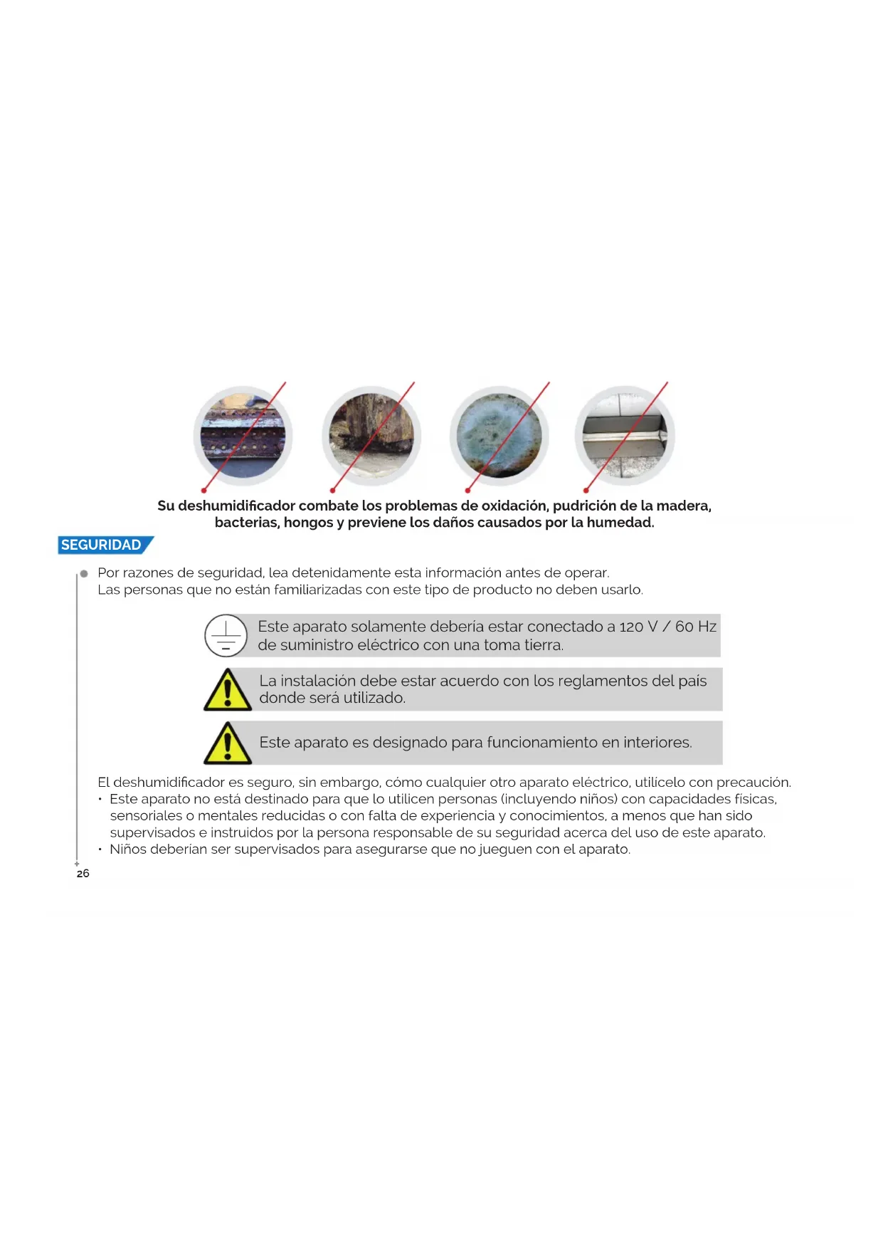 - Niños deberían ser supervisados para asegurarse que no jueguen con el aparato. La instalación debe estar acuerdo con los reglamentos del país donde será utilizado. Este aparato es designado para funcionamiento en interiores. Este aparato solamente debería estar conectado a 120 V / 60 Hz de suministro eléctrico con una toma tierra. Su deshumidicador combate los problemas de oxidación, pudrición de la madera, bacterias, hongos y previene los daños causados por la humedad. +27