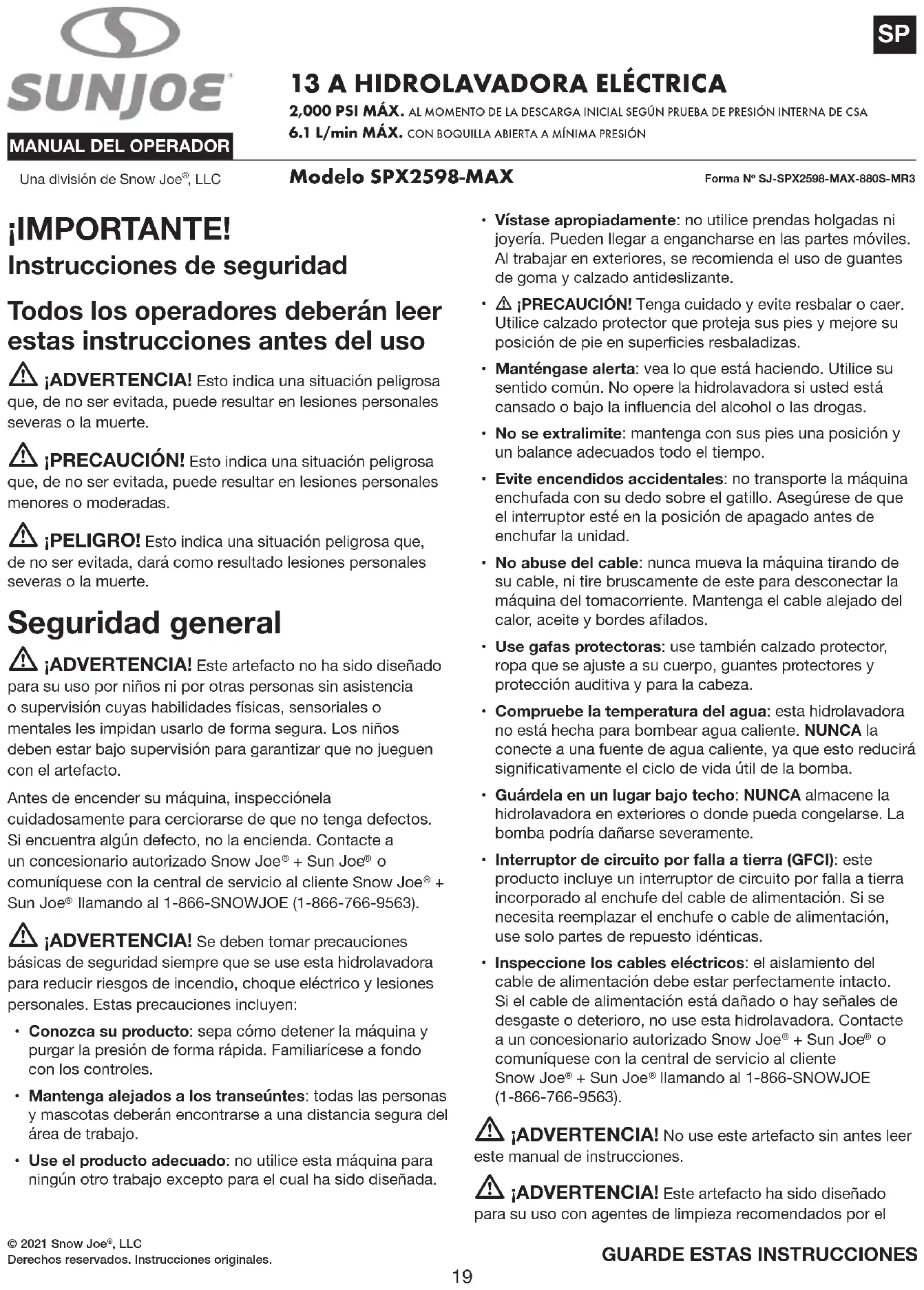 llamando al 1-866-SNOWJOE (1-866-766-9563). m ¡ADVERTENCIA! No use este artefacto sin antes leer este manual de instrucciones. m ¡ADVERTENCIA! Este artefacto ha sido diseñado para su uso con agentes de limpieza recomendados por el20 fabricante. El uso de otros agentes de limpieza o químicos puede afectar de forma negativa la seguridad del artefacto. m ¡ADVERTENCIA! No use el artefacto cerca de personas, a menos que estén usando ropa protectora. m ¡ADVERTENCIA! Los chorros de alta presión pueden ser peligrosos si se manipulan incorrectamente. El chorro no deberá estar dirigido a personas, mascotas, equipos eléctricos activos ni al artefacto en sí.