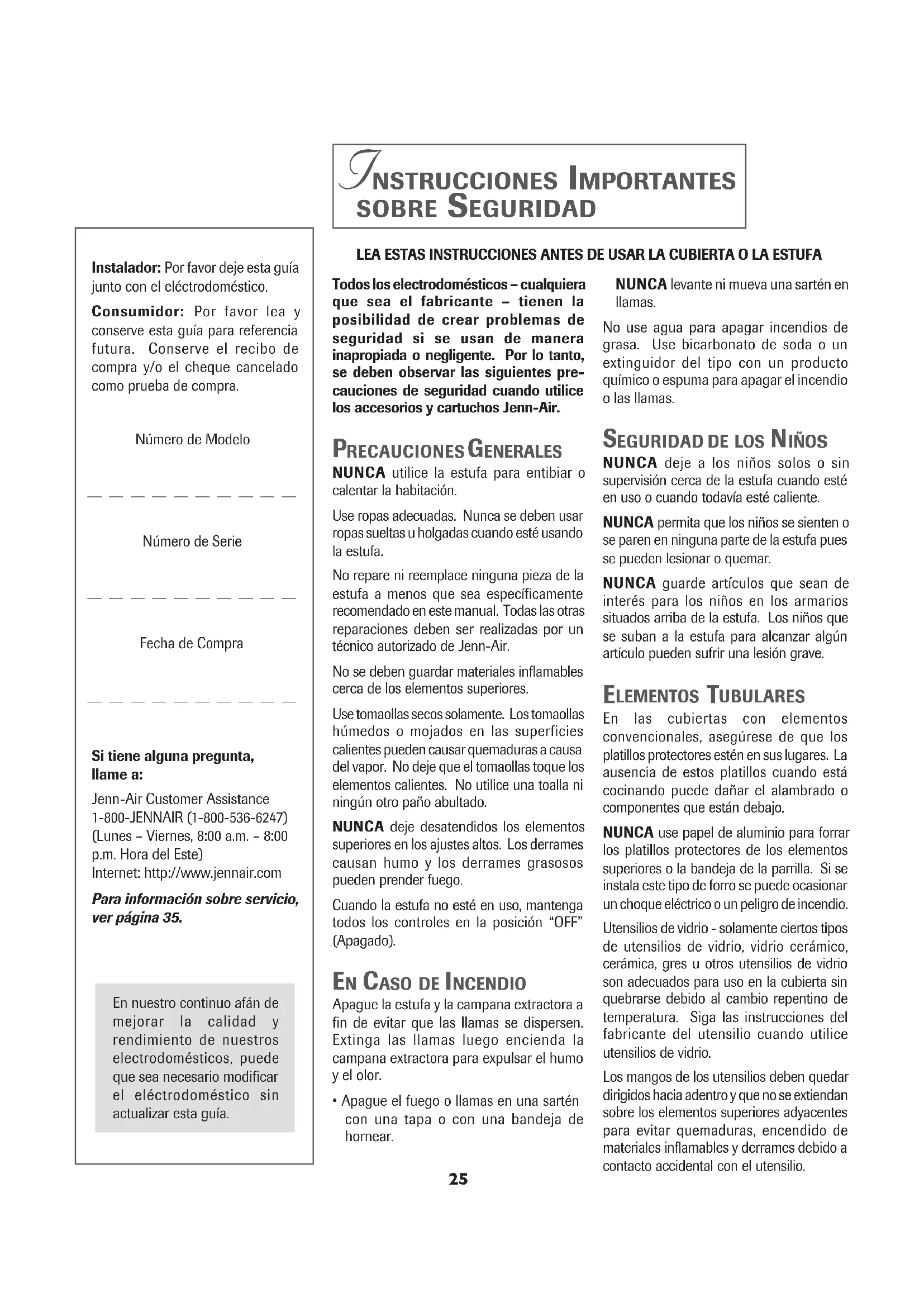 Instalador: Por favor deje esta guíajunto con el eléctrodoméstico.Consumidor: Por favor lea yconserve esta guía para referenciafutura. Conserve el recibo decompra y/o el cheque canceladocomo prueba de compra.Número de Modelo__ __ __ __ __ __ __ __ __ __Número de Serie__ __ __ __ __ __ __ __ __ __Fecha de Compra__ __ __ __ __ __ __ __ __ __Si tiene alguna pregunta,llame a:Jenn-Air Customer Assistance1-800-JENNAIR (1-800-536-6247)(Lunes – Viernes, 8:00 a.m. – 8:00p.m. Hora del Este)Internet: http://www.jennair.comPara información sobre servicio,ver página 35.En nuestro continuo afán demejorar la calidad yrendimiento de nuestroselectrodomésticos, puedeque sea necesario modificarel eléctrodoméstico sinactualizar esta guía.Todos los electrodomésticos – cualquieraque sea el fabricante – tienen laposibilidad de crear problemas deseguridad si se usan de manerainapropiada o negligente. Por lo tanto,se deben observar las siguientes pre-cauciones de seguridad cuando utilicelos accesorios y cartuchos Jenn-Air.