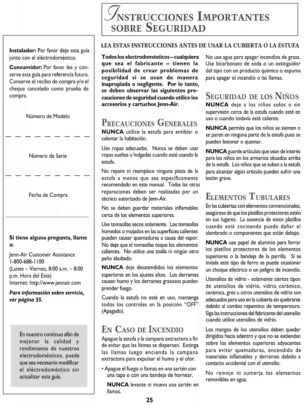No repare ni reemplaceulatinguna pieza de la estufa a menos que sea especificamente recomendado en este manual. Todas las other reparaciones deben ser realizadas por un technician autorizado de Jenn-Air.