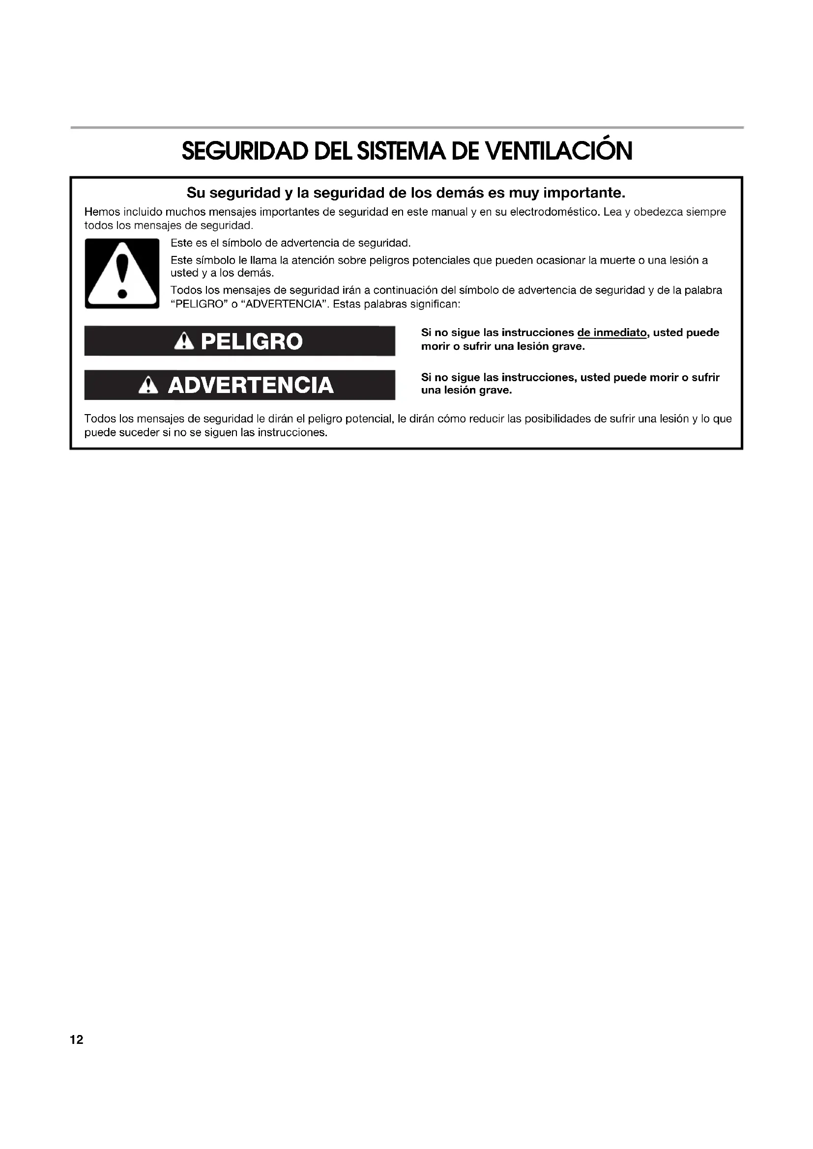 Si no sigue las instrucciones de inmediato, usted puede morir o sufrir una lesión grave. Si no sigue las instrucciones, usted puede morir o sufrir una lesión grave. Todos los mensajes de seguridad le dirán el peligro potencial, le dirán cómo reducir las posibilidades de sufrir una lesión y lo que puede suceder si no se siguen las instrucciones. Su seguridad y la seguridad de los demás es muy importante. Hemos incluido muchos mensajes importantes de seguridad en este manual y en su electrodoméstico. Lea y obedezca siempre todos los mensajes de seguridad. ADVERTENCIA PELIGRO Este es el símbolo de advertencia de seguridad. Este símbolo le llama la atención sobre peligros potenciales que pueden ocasionar la muerte o una lesión a usted y a los demás. Todos los mensajes de seguridad irán a continuación del símbolo de advertencia de seguridad y de la palabra “PELIGRO” o “ADVERTENCIA”. Estas palabras significan:13