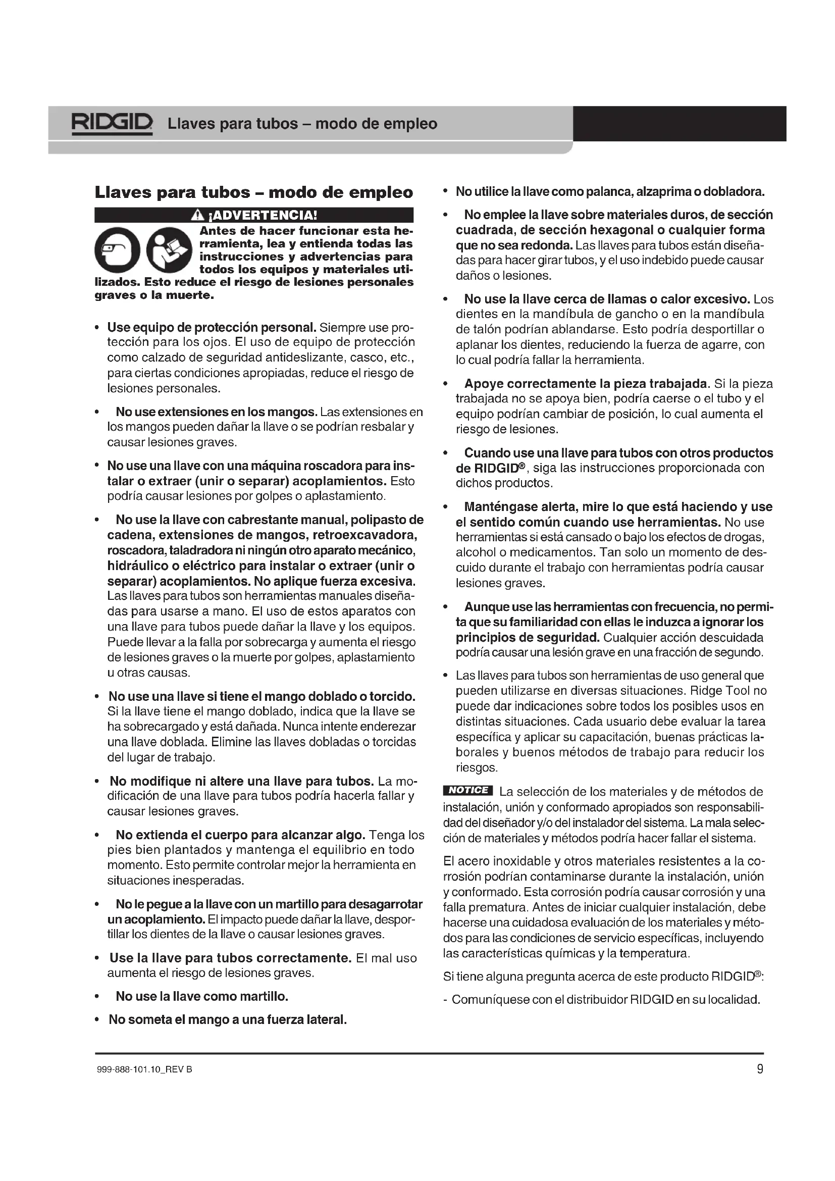Las llaves para tubos son herramientas de uso general que pueden utilizarse en diversas situaciones. Ridge Tool no puede dar indicaciones sobre todos los posibles usos en distintas situaciones. Cada usuario debe evaluar la tarea específica y aplicar su capacitación, buenas prácticas la- borales y buenos métodos de trabajo para reducir los riesgos. NOTICE La selección de los materiales y de métodos de instalación, unión y conformado apropiados son responsabili- dad del diseñador y/o del instalador del sistema. La mala selec- ción de materiales y métodos podría hacer fallar el sistema. El acero inoxidable y otros materiales resistentes a la co- rrosión podrían contaminarse durante la instalación, unión y conformado. Esta corrosión podría causar corrosión y una falla prematura. Antes de iniciar cualquier instalación, debe hacerse una cuidadosa evaluación de los materiales y méto- dos para las condiciones de servicio específicas, incluyendo las características químicas y la temperatura. Si tiene alguna pregunta acerca de este producto RIDGID