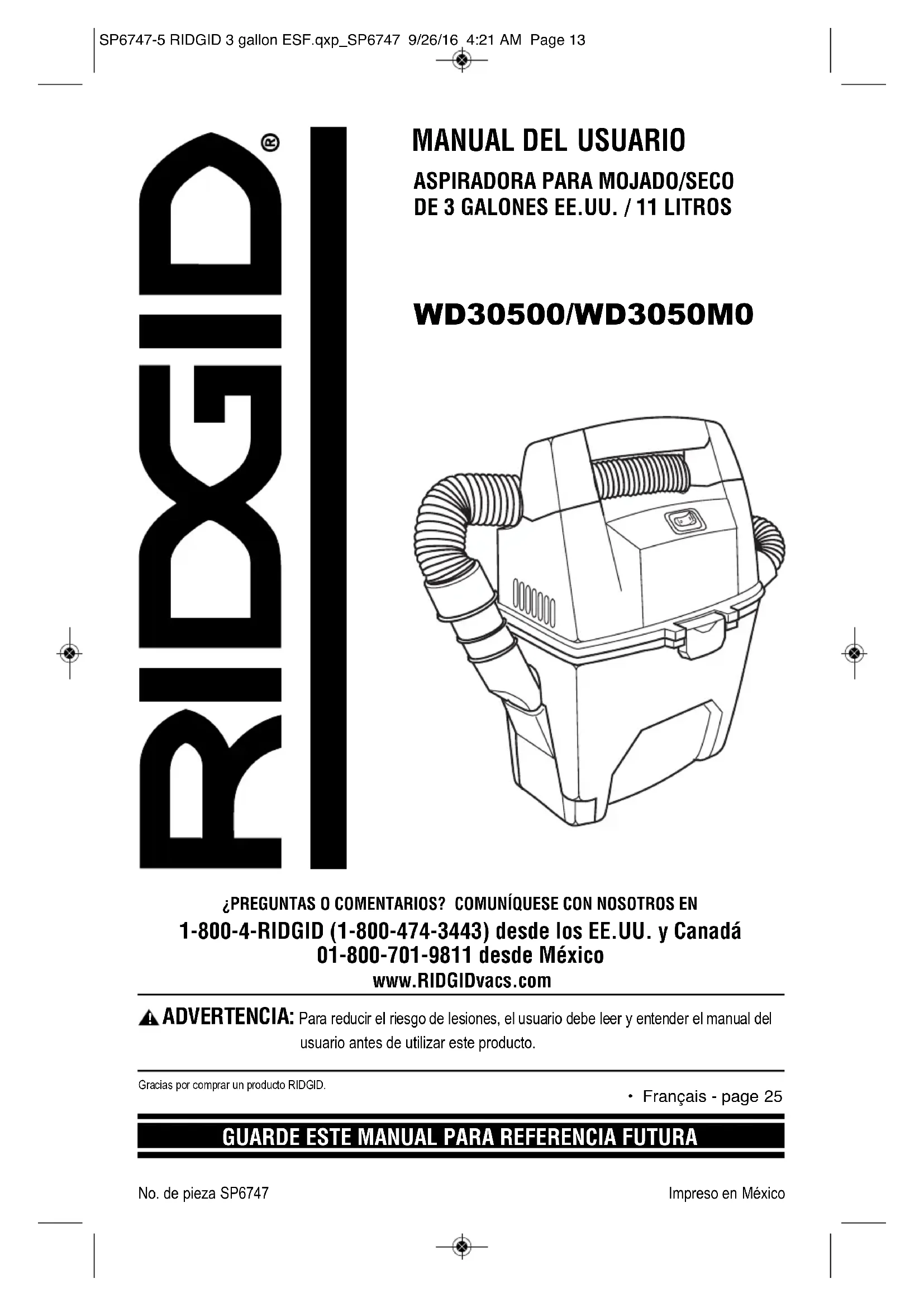 . Ningún empleado, agente, distribuidor u otra persona está autorizado a alterar esta garantía ni a dar ninguna otra garantía en nombre de Ridge Tool Company. No. de existencias WD3050/WD3050M No. de modelo WD30500/WD3050M0 Número de serie_______________________________________________________________________ Los números de modelo y de serie se pueden encontrar en la etiqueta ubicada cerca de la entrada del cordón de la aspiradora. Debe anotar tanto el número de modelo como el de serie en un lugar seguro para uso futuro. ¿PREGUNTAS O COMENTARIOS? COMUNÍQUESE CON NOSOTROS EN 1-800-4-RIDGID (1-800-474-3443) desde los EE.UU. y Canadá 01-800-701-9811 desde México www.RIDGIDvacs.com Por favor, tenga a mano su número de modelo y número de serie cuando llame. SP6747-5 RIDGID 3 gallon ESF.qxp_SP6747 9/26/16 4:21 AM Page 24WD30500/WD3050M0