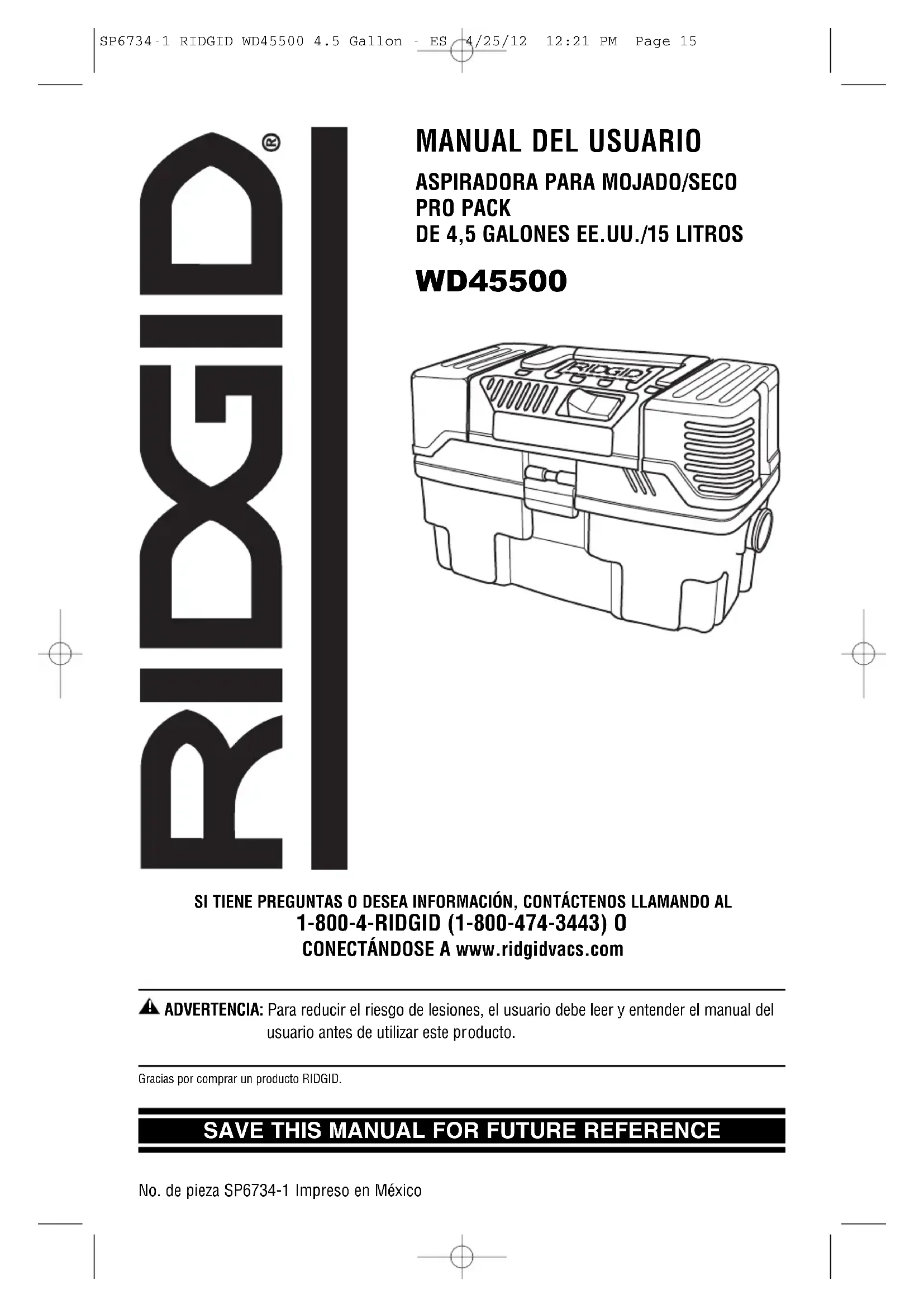 - Gracias por comprar un producto RIDGID. SP6734-1 RIDGID WD45500 4.5 Gallon - ES 4/25/12 12:21 PM Page 1516 Sección PáginaInstrucciones de seguridad importantes p. 16
