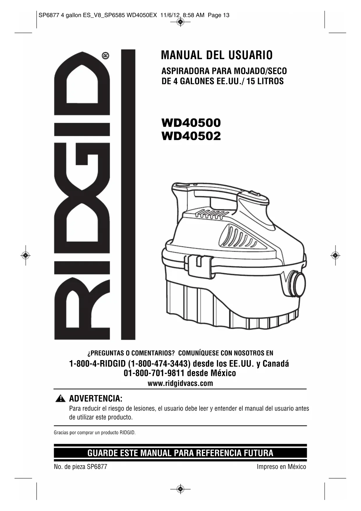 ADVERTENCIA: Para reducir el riesgo de lesiones, el usuario debe leer y entender el manual del usuario antes de utilizar este producto. Gracias por comprar un producto RIDGID. ¿PREGUNTAS O COMENTARIOS? COMUNÍQUESE CON NOSOTROS EN 1-800-4-RIDGID (1-800-474-3443) desde los EE.UU. y Canadá 01-800-701-9811 desde México www.ridgidvacs.com