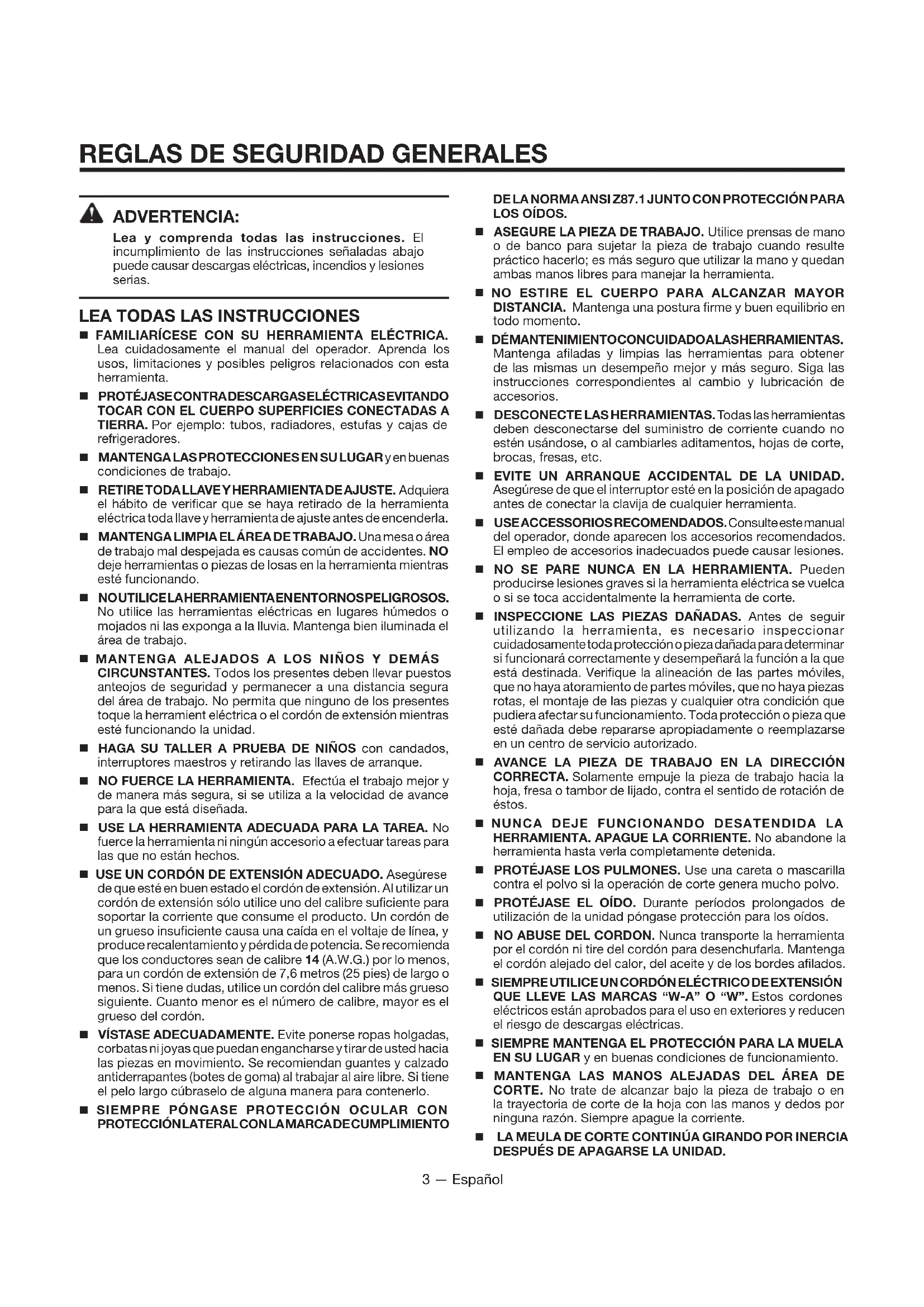 HERRAMIENTA. APAGUE LA CORRIENTE. No abandone la herramienta hasta verla completamente detenida. PROTÉJASE LOS PULMONES. Use una careta o mascarilla contra el polvo si la operación de corte genera mucho polvo. PROTÉJASE EL OÍDO. Durante períodos prolongados de utilización de la unidad póngase protección para los oídos. NO ABUSE DEL CORDON. Nunca transporte la herramienta por el cordón ni tire del cordón para desenchufarla. Mantenga el cordón alejado del calor, del aceite y de los bordes afilados. SIEMPRE UTILICE UN CORDÓN ELÉCTRICO DE EXTENSIÓN QUE LLEVE LAS MARCAS “W-A” O “W”. Estos cordones eléctricos están aprobados para el uso en exteriores y reducen el riesgo de descargas eléctricas. SIEMPRE MANTENGA EL PROTECCIÓN PARA LA MUELA EN SU LUGAR y en buenas condiciones de funcionamiento. MANTENGA LAS MANOS ALEJADAS DEL ÁREA DE CORTE. No trate de alcanzar bajo la pieza de trabajo o en la trayectoria de corte de la hoja con las manos y dedos por ninguna razón. Siempre apague la corriente. LA MEULA DE CORTE CONTINÚA GIRANDO POR INERCIA DESPUÉS DE APAGARSE LA UNIDAD.4 — Español