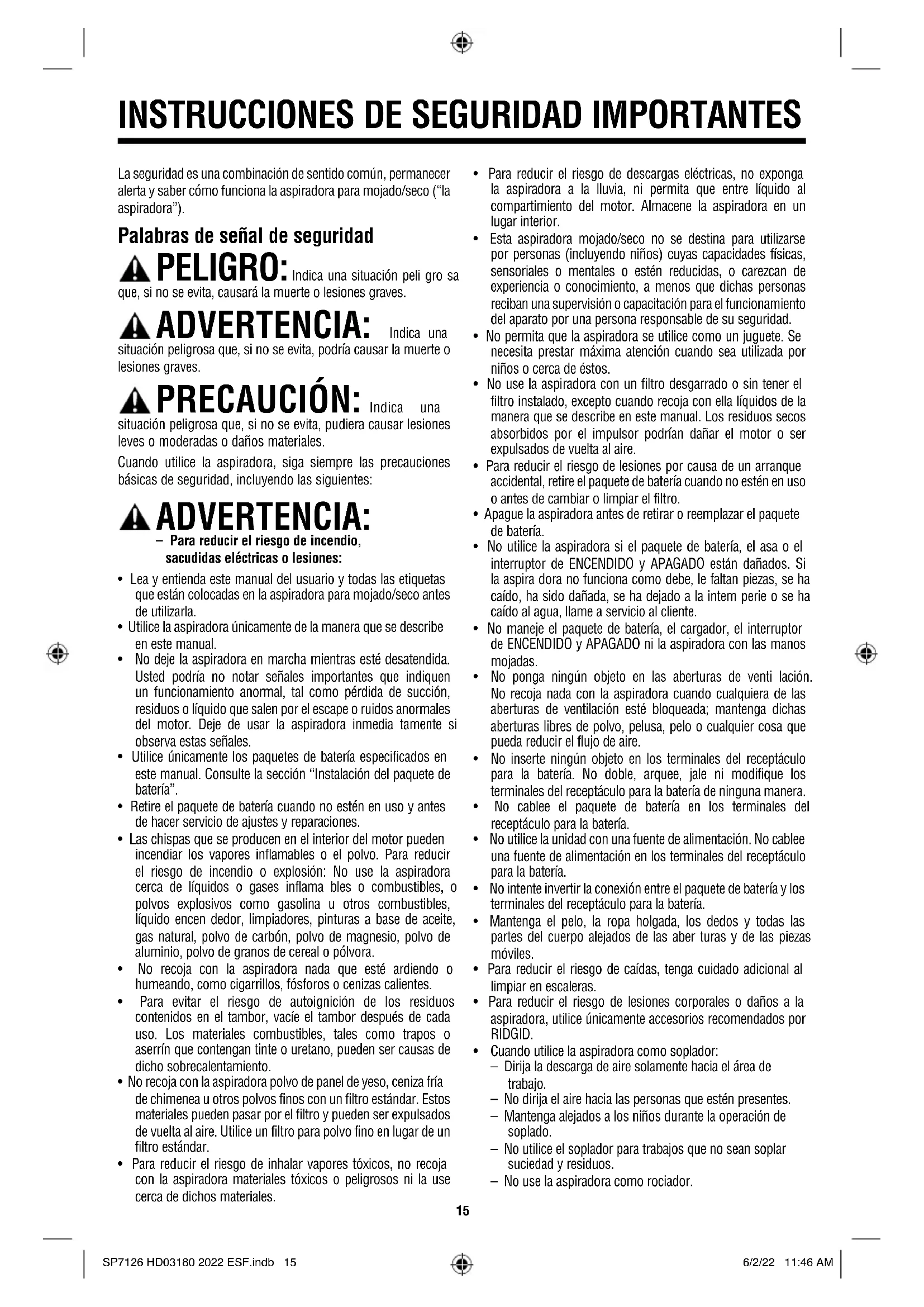 SP7126 HD03180 2022 ESF.indb 14SP7126 HD03180 2022 ESF.indb 14 6/2/22 11:46 AM6/2/22 11:46 AM15 La seguridad es una combinación de sentido común, permanecer alerta y saber cómo funciona la aspiradora para mojado/seco (“la aspiradora”). Palabras de señal de seguridad PELIGRO: Indica una situación peli gro sa que, si no se evita, causará la muerte o lesiones graves. ADVERTENCIA: Indica una situación peligrosa que, si no se evita, podría causar la muerte o lesiones graves. PRECAUCIÓN: Indica una situación peligrosa que, si no se evita, pudiera causar lesiones leves o moderadas o daños materiales. Cuando utilice la aspiradora, siga siempre las precauciones básicas de seguridad, incluyendo las siguientes: ADVERTENCIA: – Para reducir el riesgo de incendio, sacudidas eléctricas o lesiones: