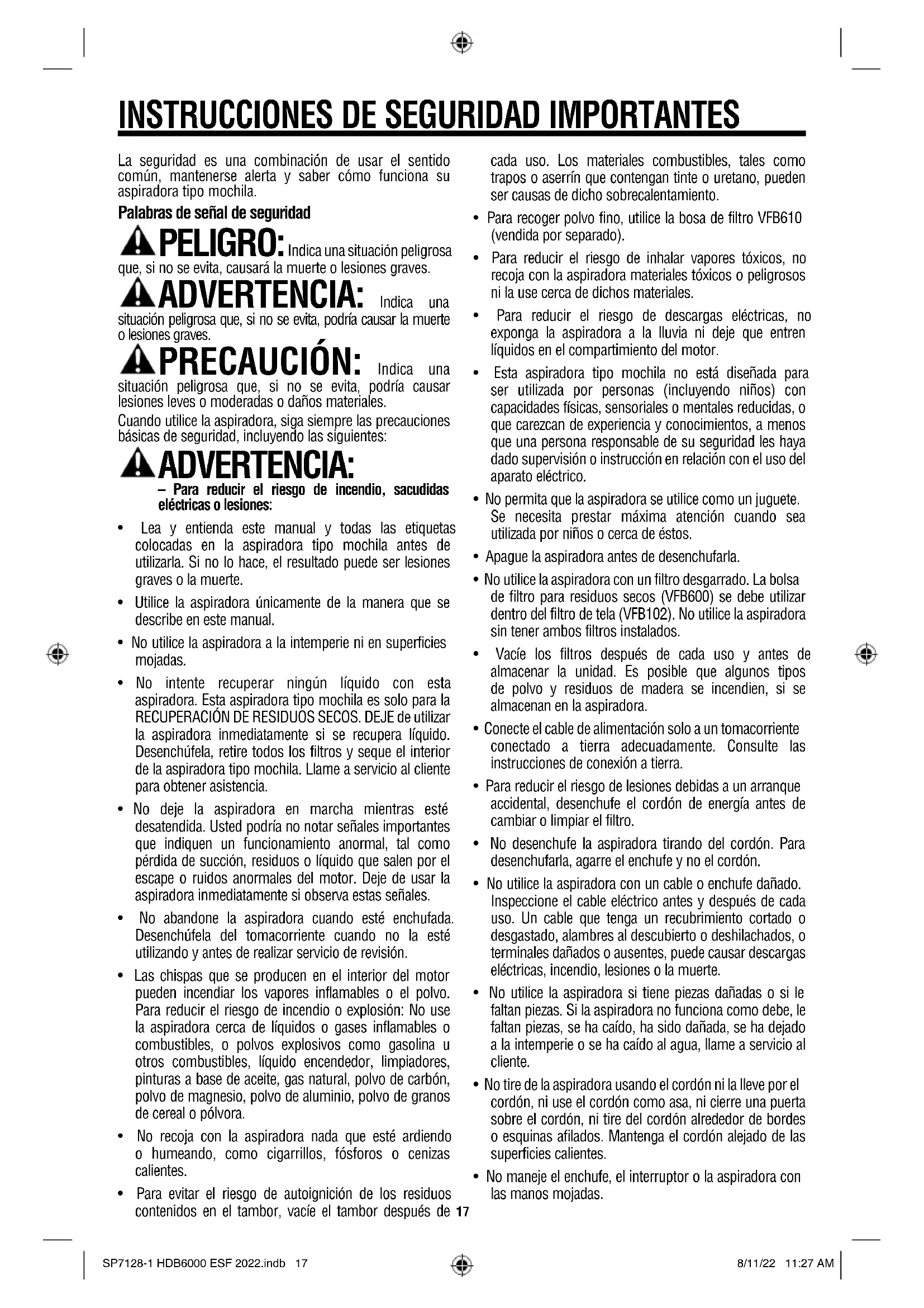 polvo, será necesario que la vacíe y limpie los filtros a intervalos más frecuentes para mantener el máximo rendimiento de la aspiradora. NOTA: Las bolsas de filtro para residuos secos son necesarias para recoger material seco solamente. ADVERTENCIA: No ponga ningún objeto en las aberturas de ventilación. No recoja nada con la aspiradora cuando cualquiera de las aberturas de ventilación esté bloqueada; mantenga dichas aberturas libres de polvo, pelusa, pelo o cualquier cosa que pueda reducir el flujo de aire. PRECAUCIÓN: Para reducir el riesgo de daños a la audición, use protectores de oídos cuando utilice la aspiradora tipo mochila durante muchas horas seguidas o cuando la emplee en un área ruidosa. ADVERTENCIA: No utilice la unidad sin todos los filtros instalados o con un filtro desgarrado. La bolsa de filtro para residuos secos (VFB600) o la bolsa de filtro para polvo fino (VFB610) se deben utilizar dentro del filtro de tela (VFB102). SP7128-1 HDB6000 ESF 2022.indb 28SP7128-1 HDB6000 ESF 2022.indb 28 8/11/22 11:27 AM8/11/22 11:27 AM29 MANTENIMIENTO