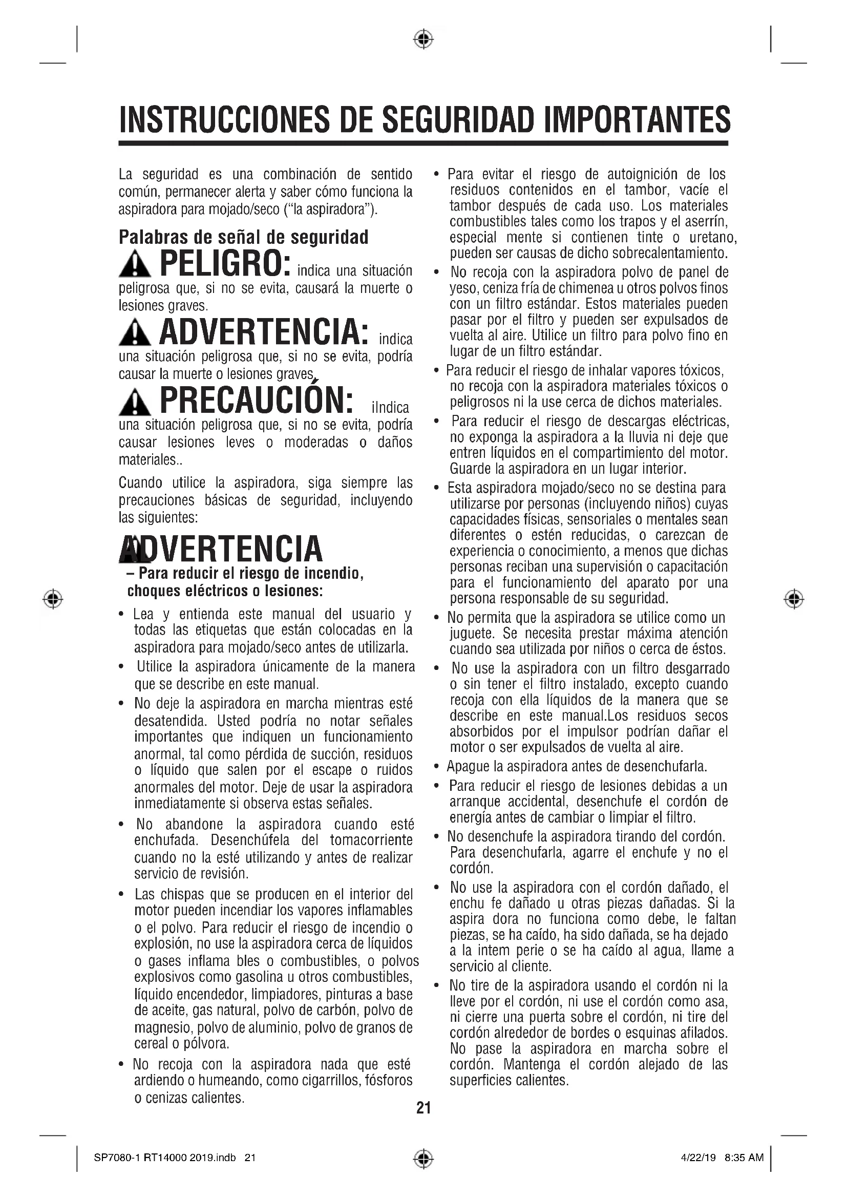 La seguridad es una combinación de sentido común, permanecer alerta y saber cómo funciona la aspiradora para mojado/seco (“la aspiradora”). Palabras de señal de seguridad PELIGRO: indica una situación peligrosa que, si no se evita, causará la muerte o lesiones graves. ADVERTENCIA: indica una situación peligrosa que, si no se evita, podría causar la muerte o lesiones graves. PRECAUCIÓN: iIndica una situación peligrosa que, si no se evita, podría causar lesiones leves o moderadas o daños materiales.. Cuando utilice la aspiradora, siga siempre las precauciones básicas de seguridad, incluyendo las siguientes: ADVERTENCIA – Para reducir el riesgo de incendio, choques eléctricos o lesiones: