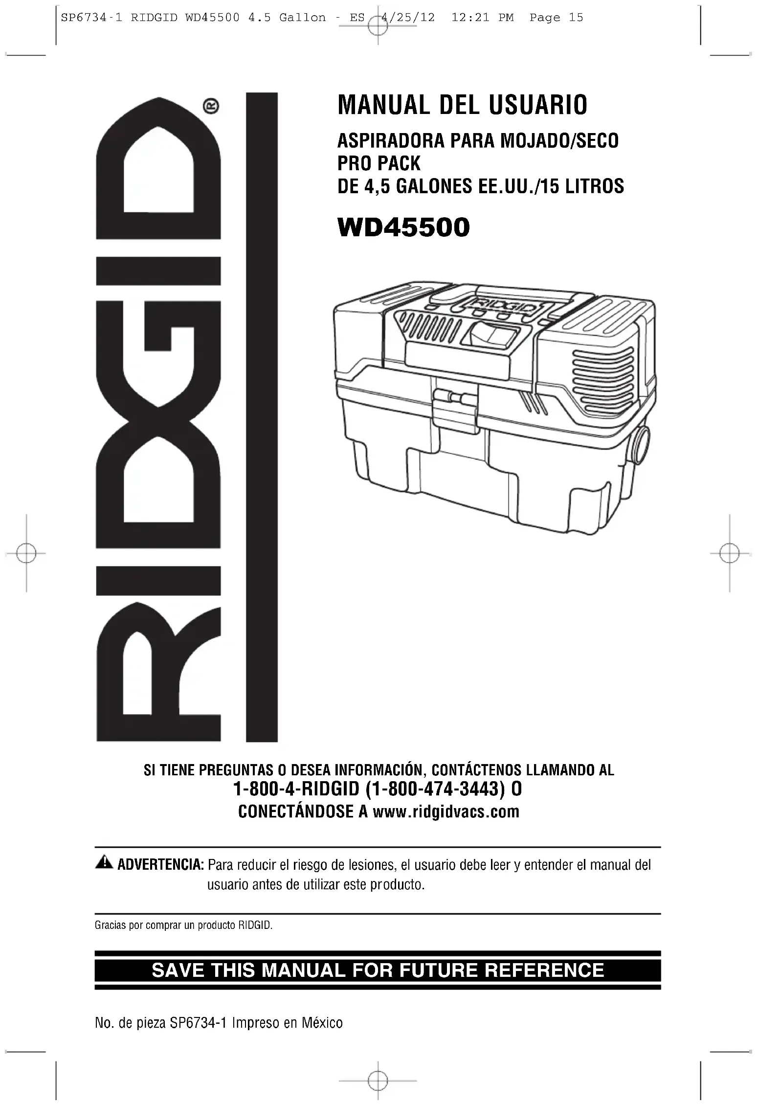 - Gracias por comprar un producto RIDGID. SP6734-1 RIDGID WD45500 4.5 Gallon - ES 4/25/12 12:21 PM Page 1516 Sección PáginaInstrucciones de seguridad importantes p. 16