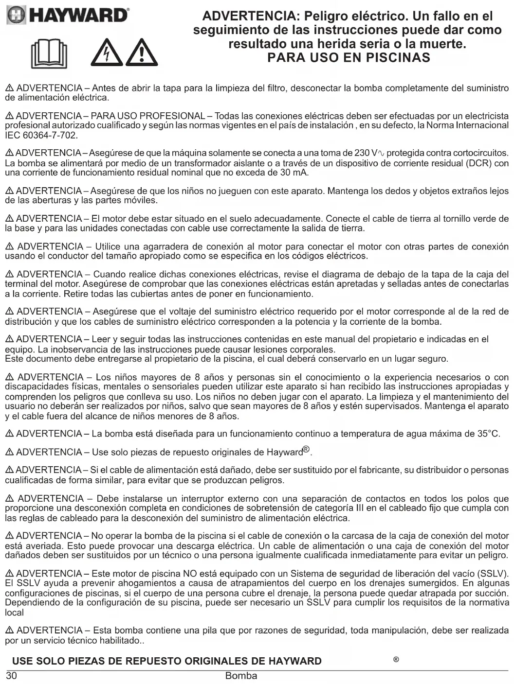 - ADVERTENCIA – Use solo piezas de repuesto originales de Hayward