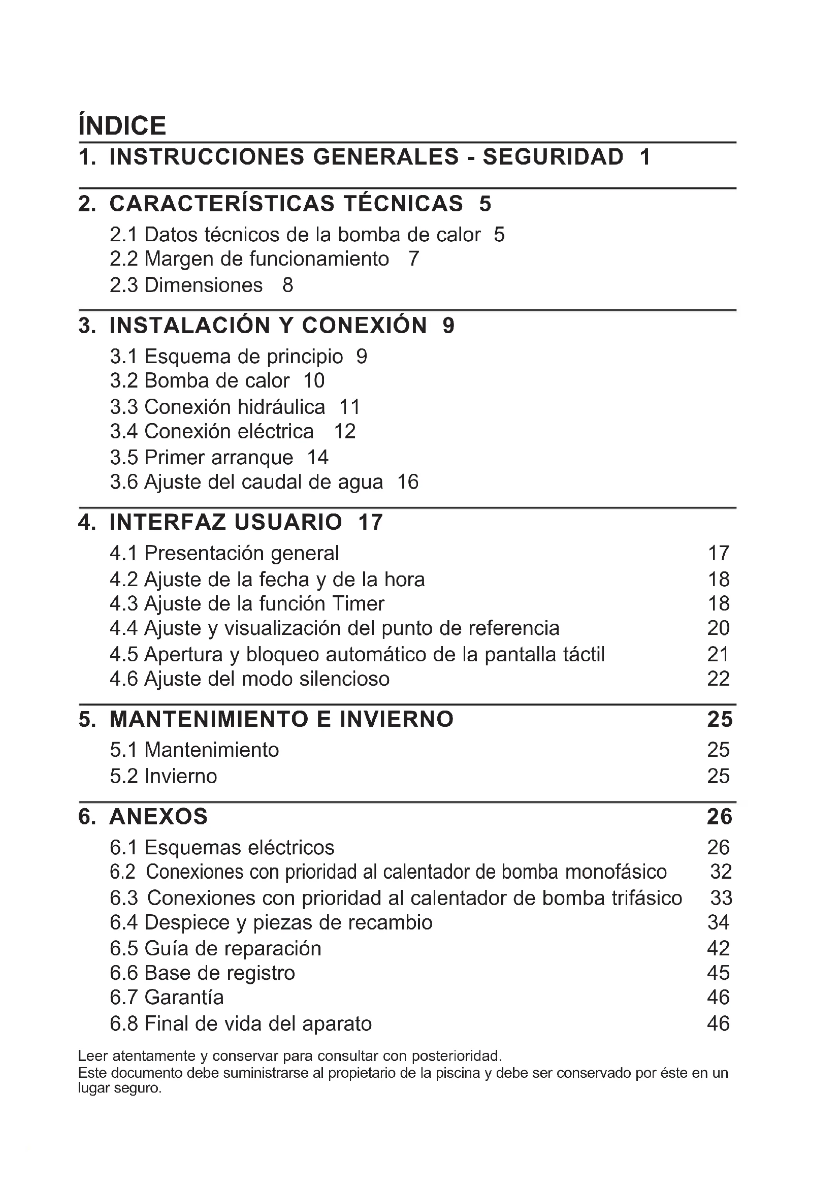 Leer atentamente y conservar para consultar con posterioridad. Este documento debe suministrarse al propietario de la piscina y debe ser conservado por éste en un lugar seguro.