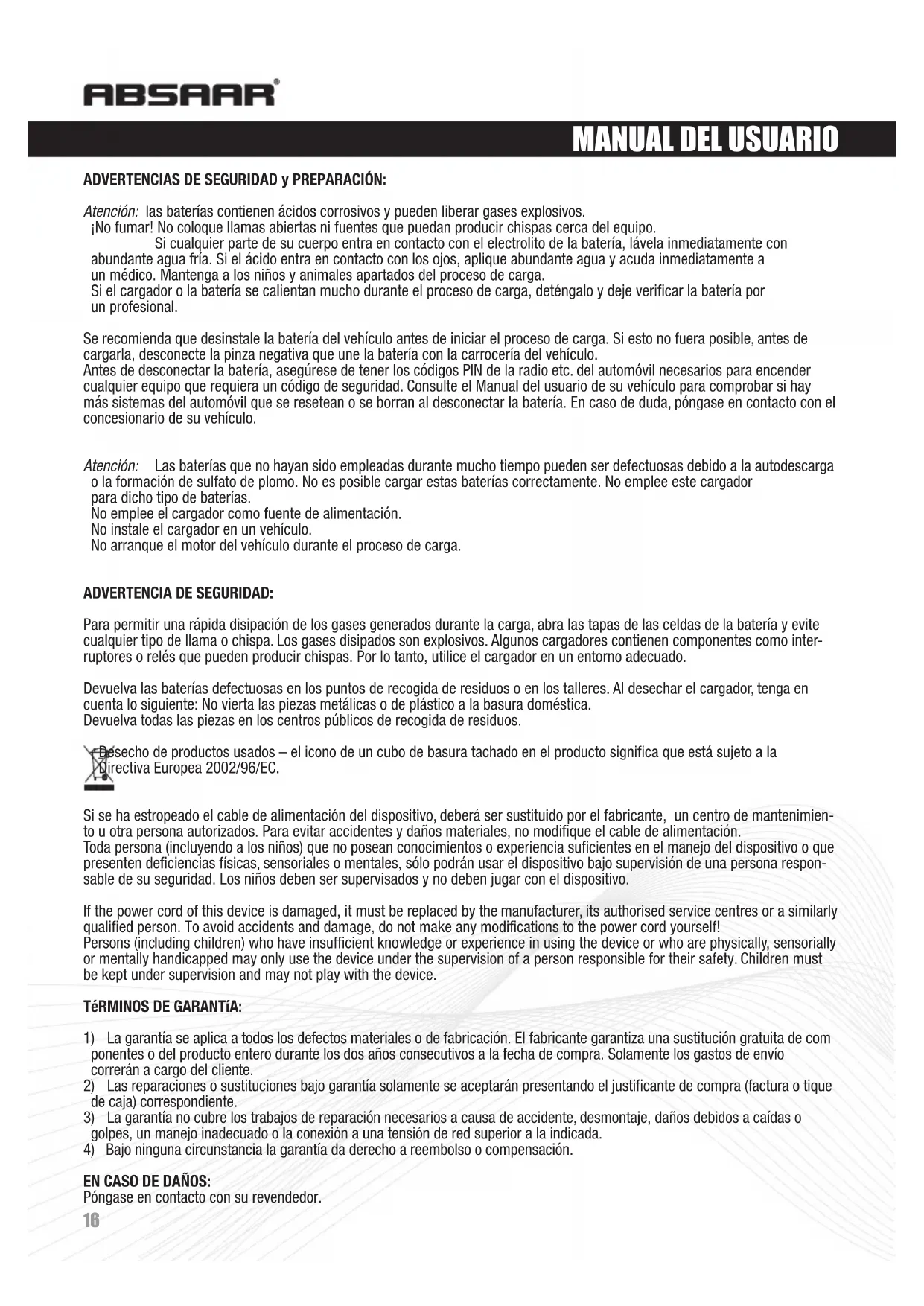 (Panel posterior) (Panel anterior) ADVERTENCIAS DE SEGURIDAD y PREPARACIÓN: Atención: las baterías contienen ácidos corrosivos y pueden liberar gases explosivos. ¡No fumar! No coloque llamas abiertas ni fuentes que puedan producir chispas cerca del equipo. Si cualquier parte de su cuerpo entra en contacto con el electrolito de la batería, lávela inmediatamente con abundante agua fría. Si el ácido entra en contacto con los ojos, aplique abundante agua y acuda inmediatamente a un médico. Mantenga a los niños y animales apartados del proceso de carga. Si el cargador o la batería se calientan mucho durante el proceso de carga, deténgalo y deje verificar la batería por un profesional. Se recomienda que desinstale la batería del vehículo antes de iniciar el proceso de carga. Si esto no fuera posible, antes de cargarla, desconecte la pinza negativa que une la batería con la carrocería del vehículo. Antes de desconectar la batería, asegúrese de tener los códigos PIN de la radio etc. del automóvil necesarios para encender cualquier equipo que requiera un código de seguridad. Consulte el Manual del usuario de su vehículo para comprobar si hay más sistemas del automóvil que se resetean o se borran al desconectar la batería. En caso de duda, póngase en contacto con el concesionario de su vehículo. Atención: Las baterías que no hayan sido empleadas durante mucho tiempo pueden ser defectuosas debido a la autodescarga o la formación de sulfato de plomo. No es posible cargar estas baterías correctamente. No emplee este cargador para dicho tipo de baterías. No emplee el cargador como fuente de alimentación. No instale el cargador en un vehículo. No arranque el motor del vehículo durante el proceso de carga. ADVERTENCIA DE SEGURIDAD: Para permitir una rápida disipación de los gases generados durante la carga, abra las tapas de las celdas de la batería y evite cualquier tipo de llama o chispa. Los gases disipados son explosivos. Algunos cargadores contienen componentes como inter- ruptores o relés que pueden producir chispas. Por lo tanto, utilice el cargador en un entorno adecuado. Devuelva las baterías defectuosas en los puntos de recogida de residuos o en los talleres. Al desechar el cargador, tenga en cuenta lo siguiente: No vierta las piezas metálicas o de plástico a la basura doméstica. Devuelva todas las piezas en los centros públicos de recogida de residuos. Desecho de productos usados – el icono de un cubo de basura tachado en el producto significa que está sujeto a la Directiva Europea 2002/96/EC. Si se ha estropeado el cable de alimentación del dispositivo, deberá ser sustituido por el fabricante, un centro de mantenimien- to u otra persona autorizados. Para evitar accidentes y daños materiales, no modifique el cable de alimentación. Toda persona (incluyendo a los niños) que no posean conocimientos o experiencia suficientes en el manejo del dispositivo o que presenten deficiencias físicas, sensoriales o mentales, sólo podrán usar el dispositivo bajo supervisión de una persona respon- sable de su seguridad. Los niños deben ser supervisados y no deben jugar con el dispositivo. If the power cord of this device is damaged, it must be replaced by the manufacturer, its authorised service centres or a similarly qualified person. To avoid accidents and damage, do not make any modifications to the power cord yourself! Persons (including children) who have insufficient knowledge or experience in using the device or who are physically, sensorially or mentally handicapped may only use the device under the supervision of a person responsible for their safety. Children must be kept under supervision and may not play with the device. TéRMINOS DE GARANTíA: 1) La garantía se aplica a todos los defectos materiales o de fabricación. El fabricante garantiza una sustitución gratuita de com ponentes o del producto entero durante los dos años consecutivos a la fecha de compra. Solamente los gastos de envío correrán a cargo del cliente. 2) Las reparaciones o sustituciones bajo garantía solamente se aceptarán presentando el justificante de compra (factura o tique de caja) correspondiente.