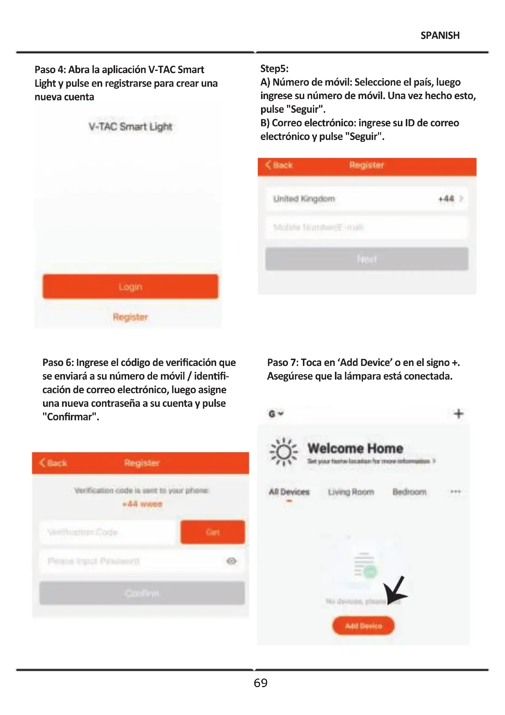 Step5: A) Número de móvil: Seleccione el país, luego ingrese su número de móvil. Una vez hecho esto, pulse "Seguir". B) Correo electrónico: ingrese su ID de correo electrónico y pulse "Seguir". Paso 6: Ingrese el código de verificación que se enviará a su número de móvil / idenfi- cación de correo electrónico, luego asigne una nueva contraseña a su cuenta y pulse "Confirmar". SPANISH