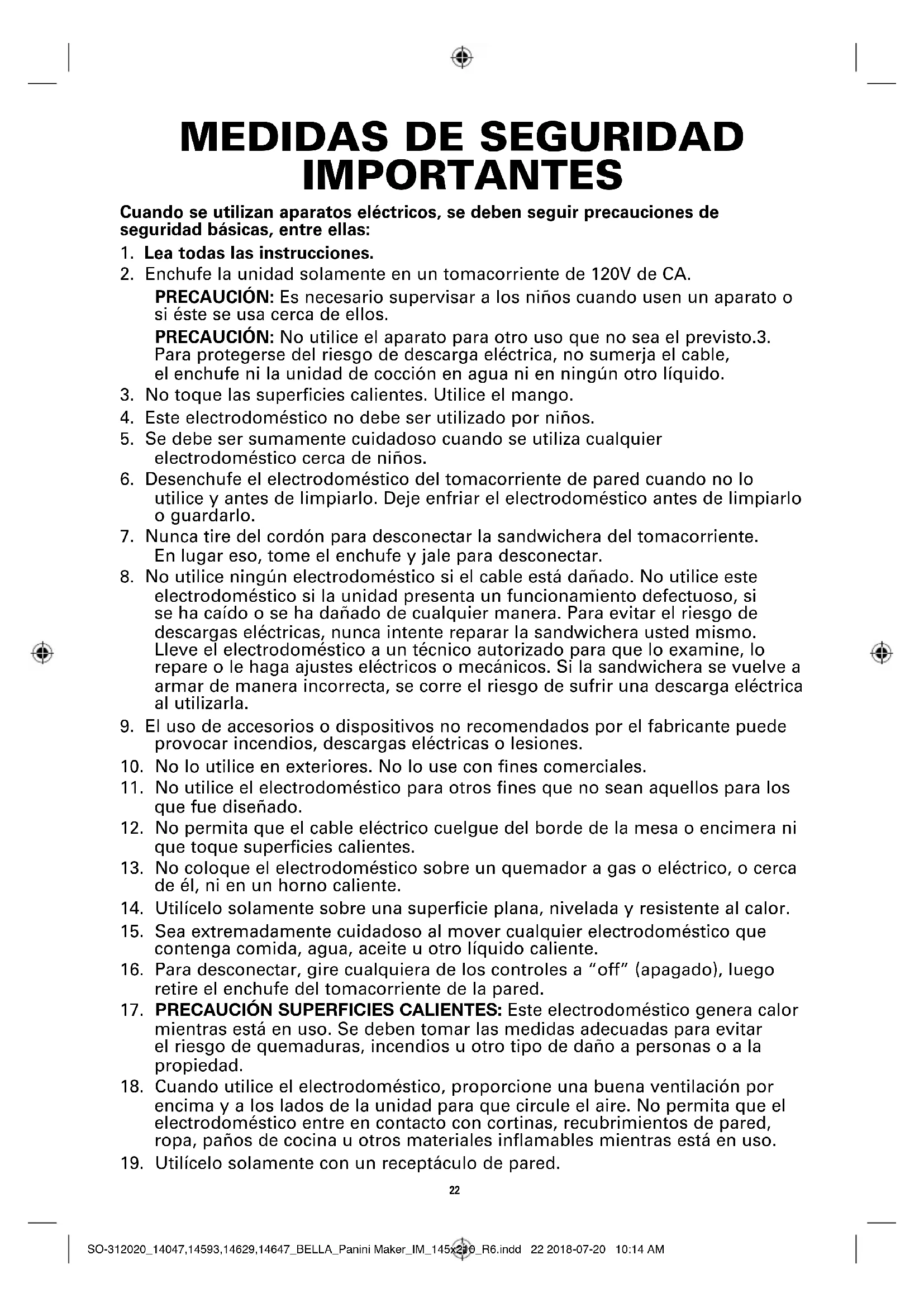 - 2 cucharaditas de tomillo fresco o 1 cucharadita de tomillo seco Mezcle en un procesador de alimentos hasta que la mezcla esté gruesa, e uniforme. SO-312020_14047,14593,14629,14647_BELLA_Panini Maker_IM_145x210_R6.indd 30 2018-07-20 10:14 AMGarantía limitada de DOS AÑOS Mediante la presente, SENSIO Inc. garantiza que, durante el plazo de DOS AÑOS a partir de la fecha de compra, este producto no presentará defectos mecánicos en el material ni en la mano de obra, y durante 90 días, no los presentará en las piezas no mecánicas. A su entera discreción, SENSIO Inc. reparará o reemplazará el producto que resulte defectuoso, o emitirá un reembolso por el producto durante el plazo de garantía. Esta garantía es válida únicamente para el comprador minorista original a partir de la fecha de compra minorista inicial y no es transferible. Conserve el recibo de compra original, ya que se exige una prueba de compra para obtener la validación de la garantía. Las tiendas minoristas no tienen derecho a alterar, modicar ni corregir de ninguna manera los términos y condiciones de la garantía. EXCLUSIONES: La garantía no cubre el desgaste normal de las piezas ni el daño ocasionado por cualquiera de las siguientes causas: uso negligente del producto, uso de un voltaje o corriente incorrectos, mantenimiento de rutina inadecuado, uso contrario al de las instrucciones de funcionamiento, desarmado, reparación o alteración a cargo de personas que no sean miembros del personal calicado de SENSIO Inc. Asimismo, la garantía no cubre actos de la naturaleza, como incendios, inundaciones, huracanes o tornados. SENSIO Inc. no asumirá responsabilidad por daños incidentales o resultantes ocasionados por la violación de cualquier garantía expresa o implícita. Salvo en la medida en que lo prohíban las leyes aplicables, cualquier garantía implícita de comerciabilidad o aptitud para un propósito particular se limita temporalmente a la duración de la garantía. Algunos estados, provincias o jurisdicciones no permiten la exclusión ni la limitación de daños incidentales o resultantes, o limitaciones sobre la duración de una garantía implícita y, por lo tanto, es posible que las exclusiones o limitaciones mencionadas no le correspondan. La garantía cubre derechos legales especícos que pueden variar de un estado, una provincia o una jurisdicción a otros. CÓMO OBTENER EL SERVICIO DE GARANTÍA: Debe comunicarse con el Servicio de atención al cliente a nuestro número telefónico gratuito: 1-866-832-4843. Un representante del Servicio de atención al cliente intentará resolver los problemas referidos a la garantía por teléfono. Si este no puede resolver el problema, le proporcionarán un número de caso y le solicitarán que devuelva el producto a SENSIO Inc. Adhiera una etiqueta al producto que incluya: su nombre, dirección, número telefónico de contacto durante el día, número de caso y descripción del problema. Además, incluya una copia del recibo de compra original. Envuelva cuidadosamente el producto etiquetado con el recibo de compra, y envíelo (con el envío y el seguro prepagados) a la dirección de SENSIO Inc. SENSIO Inc. no asumirá obligación ni responsabilidad alguna por el producto devuelto que esté en el trayecto hacia el Centro de servicio al cliente de SENSIO Inc.