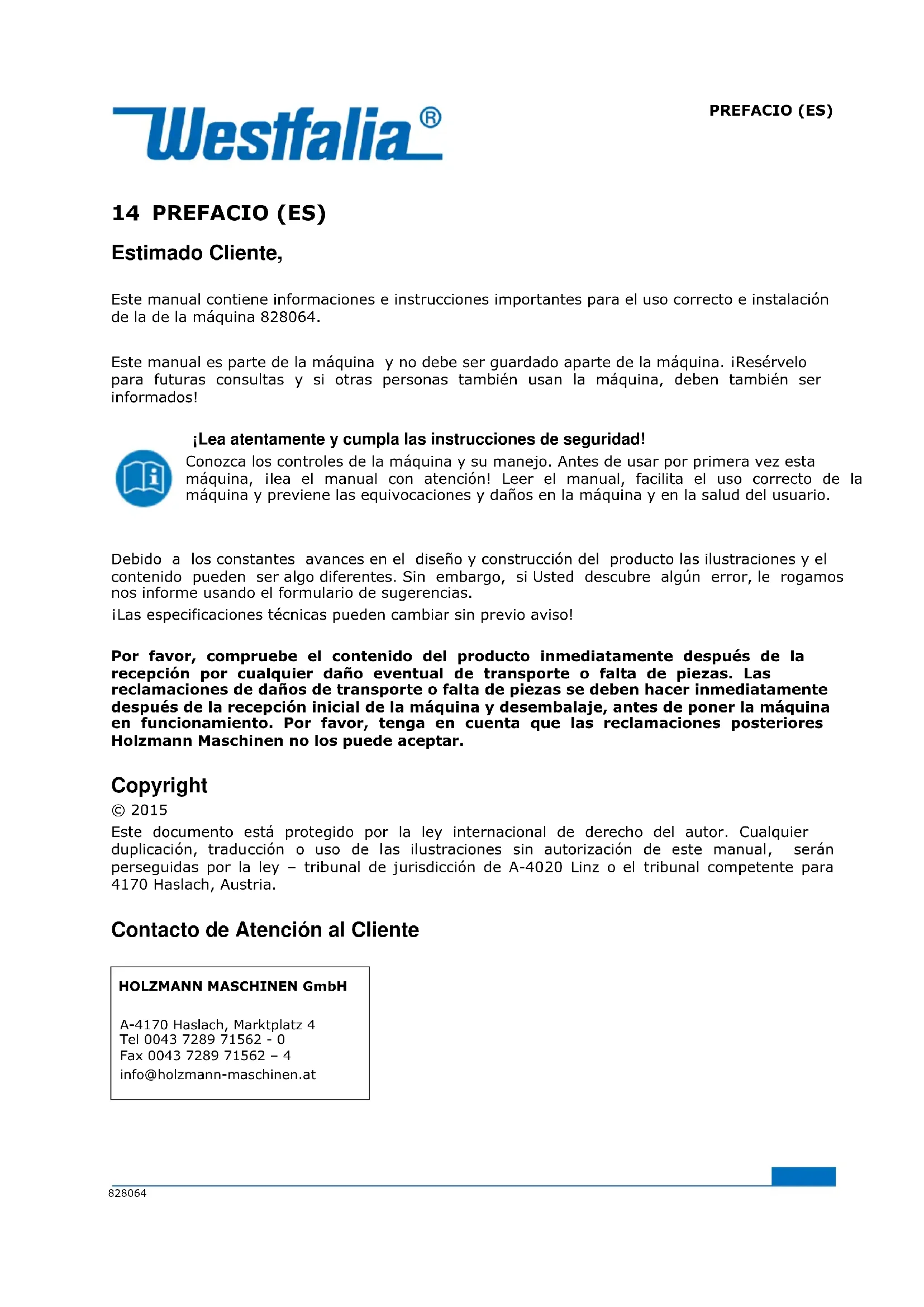 Debido a los constantes avances en el diseño y construcción del producto las ilustraciones y el contenido pueden ser algo diferentes. Sin embargo, si Usted descubre algún error, le rogamos nos informe usando el formulario de sugerencias. ¡Las especificaciones técnicas pueden cambiar sin previo aviso! Por favor, compruebe el contenido del producto inmediatamente después de la recepción por cualquier daño eventual de transporte o falta de piezas. Las reclamaciones de daños de transporte o falta de piezas se deben hacer inmediatamente después de la recepción inicial de la máquina y desembalaje, antes de poner la máquina en funcionamiento. Por favor, tenga en cuenta que las reclamaciones posteriores Holzmann Maschinen no los puede aceptar. Copyright © 2015 Este documento está protegido por la ley internacional de derecho del autor. Cualquier duplicación, traducción o uso de las ilustraciones sin autorización de este manual, serán perseguidas por la ley – tribunal de jurisdicción de A-4020 Linz o el tribunal competente para 4170 Haslach, Austria. Contacto de Atención al Cliente