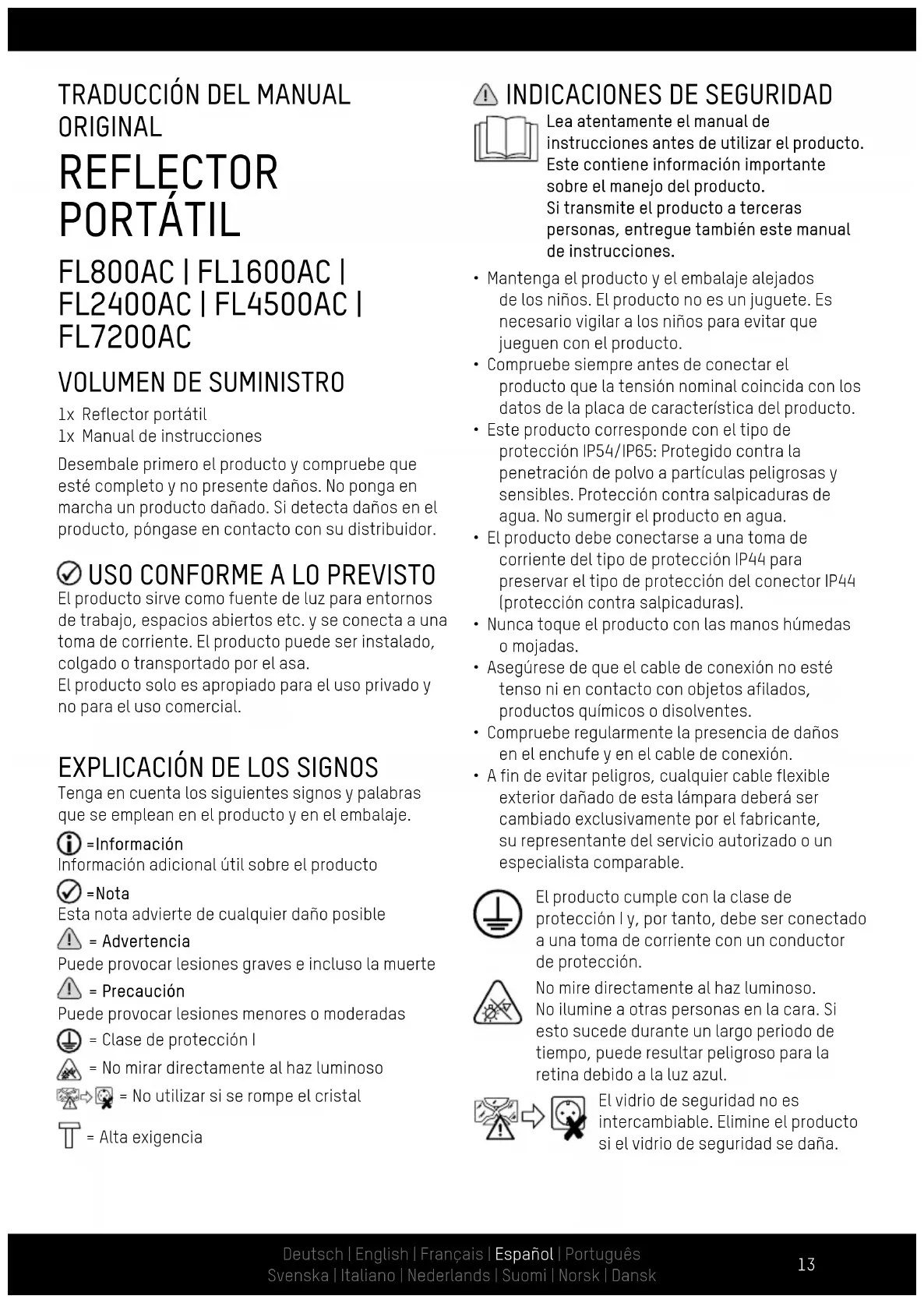 - A fin de evitar peligros, cualquier cable flexible exterior dañado de esta lámpara deberá ser cambiado exclusivamente por el fabricante, su representante del servicio autorizado o un especialista comparable. El producto cumple con la clase de protección I y, por tanto, debe ser conectado a una toma de corriente con un conductor de protección. No mire directamente al haz luminoso. No ilumine a otras personas en la cara. Si esto sucede durante un largo periodo de tiempo, puede resultar peligroso para la retina debido a la luz azul. El vidrio de seguridad no es intercambiable. Elimine el producto si el vidrio de seguridad se daña.Deutsch | English | Français | Español | Português Svenska | Italiano | Nederlands | Suomi | Norsk | Dansk Deutsch | English | Français | Español | Português Svenska | Italiano | Nederlands | Suomi | Norsk | Dansk