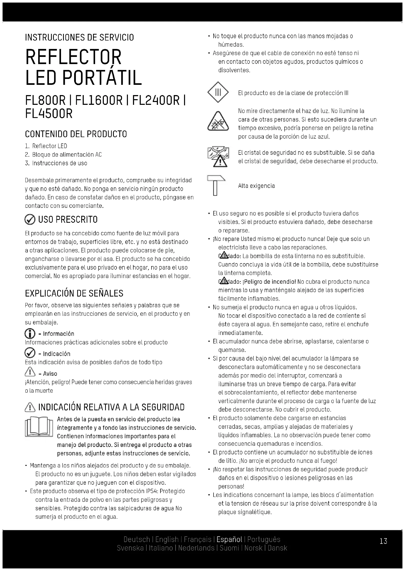 Desembale primeramente el producto, compruebe su integridad y que no esté dañado. No ponga en servicio ningún producto dañado. En caso de constatar daños en el producto, póngase en contacto con su comerciante. USO PRESCRITO El producto se ha concebido como fuente de luz móvil para entornos de trabajo, superficies libre, etc. y no está destinado a otras aplicaciones. El producto puede colocarse de pie, engancharse o llevarse por el asa. El producto se ha concebido exclusivamente para el uso privado en el hogar, no para el uso comercial. No es apropiado para iluminar estancias en el hogar.