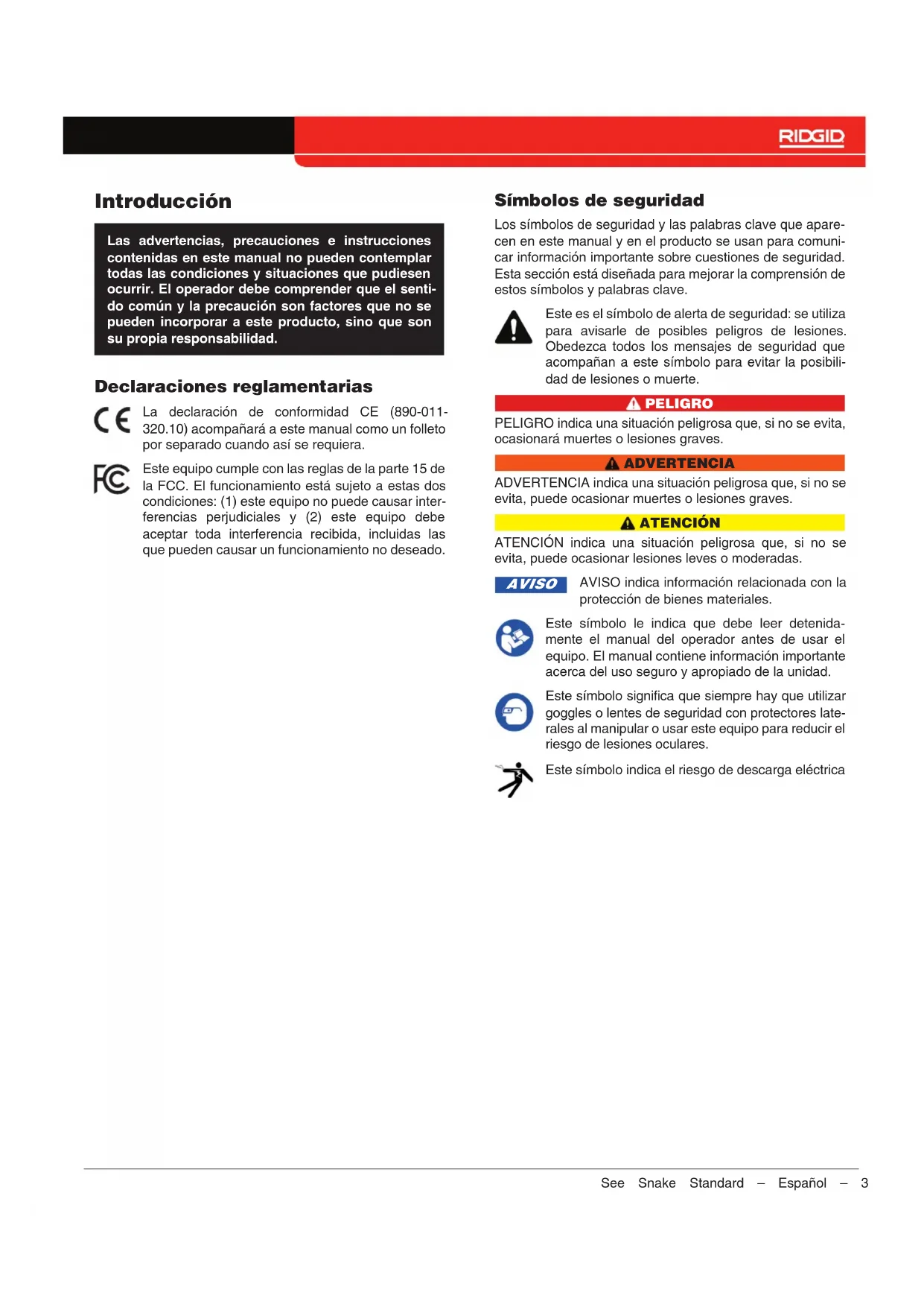 - Contactez le Service Technique de Ridge Tool Compa- ny à rtctechservices@emerson.com ou aux États-Unis et au Canada, appelez le 1-800-519-3456. Mise au rebut Certaines parties de votre système contiennent des matéri- aux de valeur qui peuvent être recyclés. Des sociétés spé- cialisées dans le recyclage peuvent se trouver au niveau local. La mise au rebut des composants doit être effectuée conformément aux réglementations applicables. Contacter les autorités de gestion des déchets pour plus d’informa- tions. Pays de la CE : ne jetez pas les équipements électriques avec les déchets ménagers ! Conformément à la Directive européenne 2012/19/UE relative aux déchets d'équipements électriques et électroniques et à son intégration dans la législation nationale, tout équipement électrique qui n'est plus utilisable doit être col- lecté séparément et éliminé d'une manière ne causant pas de dommages à l'environnement. Mise au rebut des piles Pays CE : les piles défectueuses ou usées doivent être re- cyclées conformément à la norme 2006/66/EEC.Manual del operador STANDARD Si desea obtener ayuda o más información sobre el uso de su See Snake Standard, vis- ite support.seesnake.com/es/standard o escanee este código QR. ¡ADVERTENCIA! Lea detenidamente este Ma- nual del Usuario antes de usar esta herramienta. El no entender ni cumplir con el contenido de este manual puede tener como conse-cuencia descargas eléctri-cas, incendios, y/o lesiones personales graves. Traducción de las instrucciones originales – Español – 1 Con tecnología2 – Español – See Snake Standard Índice Introducción Declaraciones reglamentarias ..................................................................................................................................3 Símbolos de seguridad ...........................................................................................................................................3 Reglas generales de seguridad Seguridad en el área de trabajo ...............................................................................................................................4 Seguridad eléctrica .................................................................................................................................................4 Seguridad personal ................................................................................................................................................4 Uso y cuidado del equipo ........................................................................................................................................5 Inspección previa al uso ..........................................................................................................................................5 Descripción general de See Snake Standard Descripción ............................................................................................................................................................6 Especificaciones.....................................................................................................................................................7 Equipamiento estándar ...........................................................................................................................................7 Componentes del sistema .......................................................................................................................................8 Información específica de seguridad Seguridad SeeSnake Standard ................................................................................................................................ 8 Montaje Montaje de las ruedas .............................................................................................................................................9 Instrucciones de funcionamiento Colocación .............................................................................................................................................................9 Visión general de la inspección ..............................................................................................................................10 Guías de tubería ..................................................................................................................................................10 Mantenimiento y asistencia Limpieza ..............................................................................................................................................................10 Componentes de mantenimiento ............................................................................................................................10 Almacenamiento ..................................................................................................................................................10 Asistencia ............................................................................................................................................................ 10 Servicio y reparación ............................................................................................................................................ 11 Desecho .............................................................................................................................................................. 11See Snake Standard – Español – 3 Introducción Las advertencias, precauciones e instrucciones contenidas en este manual no pueden contemplar todas las condiciones y situaciones que pudiesen ocurrir. El operador debe comprender que el senti- do común y la precaución son factores que no se pueden incorporar a este producto, sino que son su propia responsabilidad. Declaraciones reglamentarias La declaración de conformidad CE (890-011- 320.10) acompañará a este manual como un folleto por separado cuando así se re