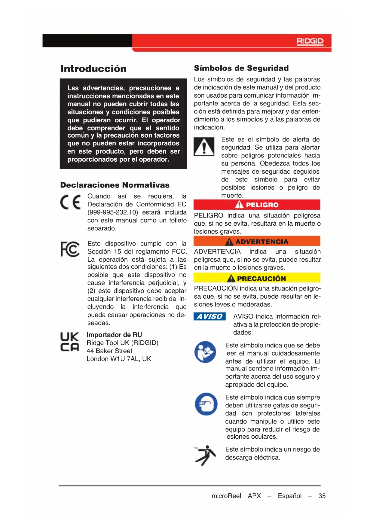- Apéndice Apéndice A: cómo reinsertar el cable de empuje *Traducción de las instrucciones originales – Español ÍndicemicroReel APX – Español – 35 Introducción Las advertencias, precauciones e instrucciones mencionadas en este manual no pueden cubrir todas las situaciones y condiciones posibles que pudieran ocurrir. El operador debe comprender que el sentido común y la precaución son factores que no pueden estar incorporados en este producto, pero deben ser proporcionados por el operador. Declaraciones Normativas Cuando así se requiera, la Declaración de Conformidad EC (999-995-232.10) estará incluida con este manual como un folleto separado. Este dispositivo cumple con la Sección 15 del reglamento FCC. La operación está sujeta a las siguientes dos condiciones: (1) Es posible que este dispositivo no cause interferencia perjudicial, y (2) este dispositivo debe aceptar cualquier interferencia recibida, in- cluyendo la interferencia que pueda causar operaciones no de- seadas. Importador de RU Ridge Tool UK (RIDGID) 44 Baker Street London W1U 7AL, UK Símbolos de Seguridad Los símbolos de seguridad y las palabras de indicación de este manual y del producto son usados para comunicar información im- portante acerca de la seguridad. Esta sec- ción está definida para mejorar y dar enten- dimiento a los símbolos y a las palabras de indicación. Este es el símbolo de alerta de seguridad. Se utiliza para alertar sobre peligros potenciales hacia su persona. Obedezca todos los mensajes de seguridad seguidos de este símbolo para evitar posibles lesiones o peligro de muerte. PELIGRO PELIGRO indica una situación peligrosa que, si no se evita, resultará en la muerte o lesiones graves. ADVERTENCIA ADVERTENCIA indica una situación peligrosa que, si no se evita, puede resultar en la muerte o lesiones graves. PRECAUCIÓN PRECAUCIÓN indica una situación peligro- sa que, si no se evita, puede resultar en le- siones leves o moderadas. AVISO AVISO indica información rel- ativa a la protección de propie- dades. Este símbolo indica que se debe leer el manual cuidadosamente antes de utilizar el equipo. El manual contiene información im- portante acerca del uso seguro y apropiado del equipo. Este símbolo indica que siempre deben utilizarse gafas de seguri- dad con protectores laterales cuando manipule o utilice este equipo para reducir el riesgo de lesiones oculares. Este símbolo indica un riesgo de descarga eléctrica.36 – Español – microReel APX p. 47