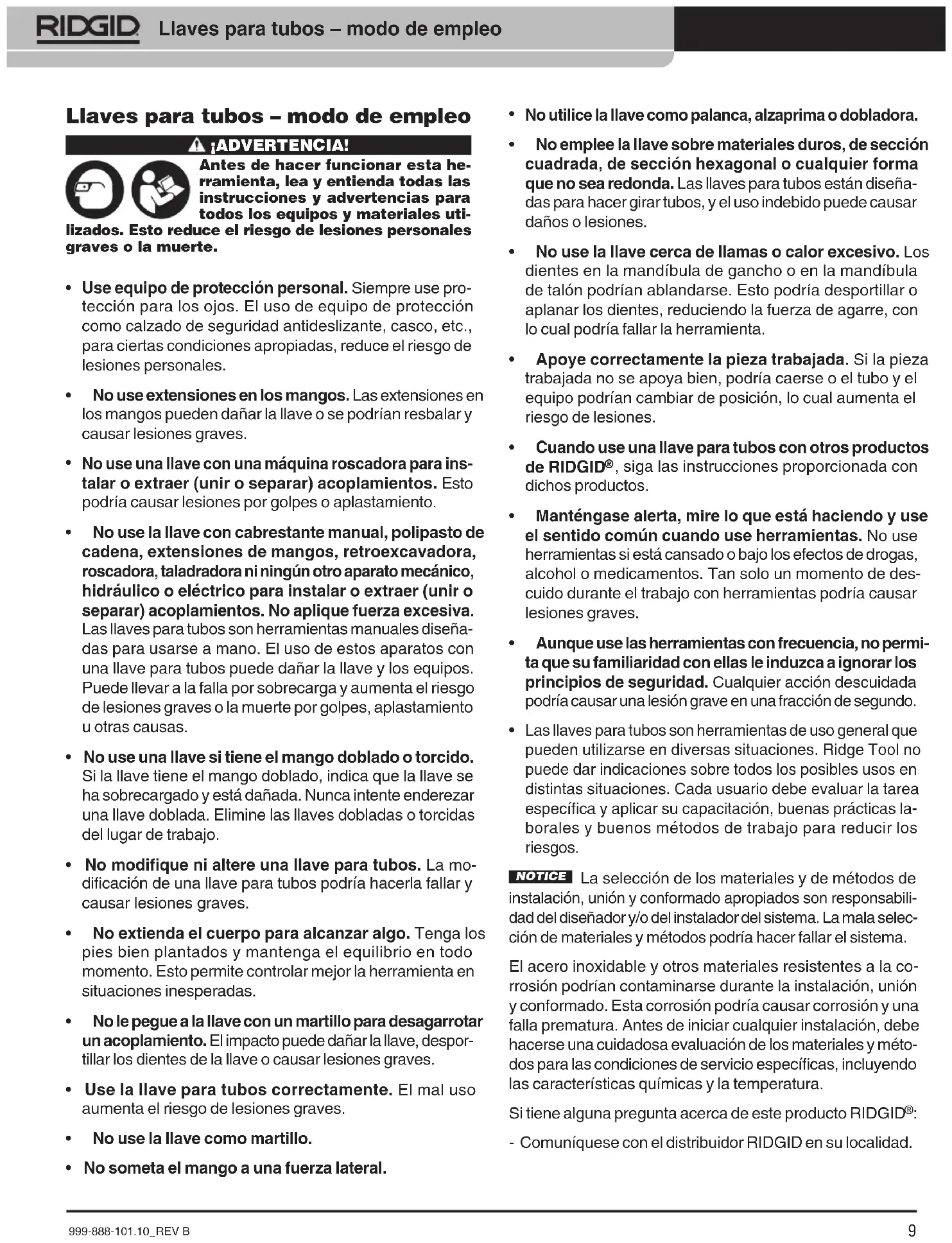 Las llaves para tubos son herramientas de uso general que pueden utilizarse en diversas situaciones. Ridge Tool no puede dar indicaciones sobre todos los posibles usos en distintas situaciones. Cada usuario debe evaluar la tarea específica y aplicar su capacitación, buenas prácticas la- borales y buenos métodos de trabajo para reducir los riesgos. NOTICE La selección de los materiales y de métodos de instalación, unión y conformado apropiados son responsabili- dad del diseñador y/o del instalador del sistema. La mala selec- ción de materiales y métodos podría hacer fallar el sistema. El acero inoxidable y otros materiales resistentes a la co- rrosión podrían contaminarse durante la instalación, unión y conformado. Esta corrosión podría causar corrosión y una falla prematura. Antes de iniciar cualquier instalación, debe hacerse una cuidadosa evaluación de los materiales y méto- dos para las condiciones de servicio específicas, incluyendo las características químicas y la temperatura. Si tiene alguna pregunta acerca de este producto RIDGID