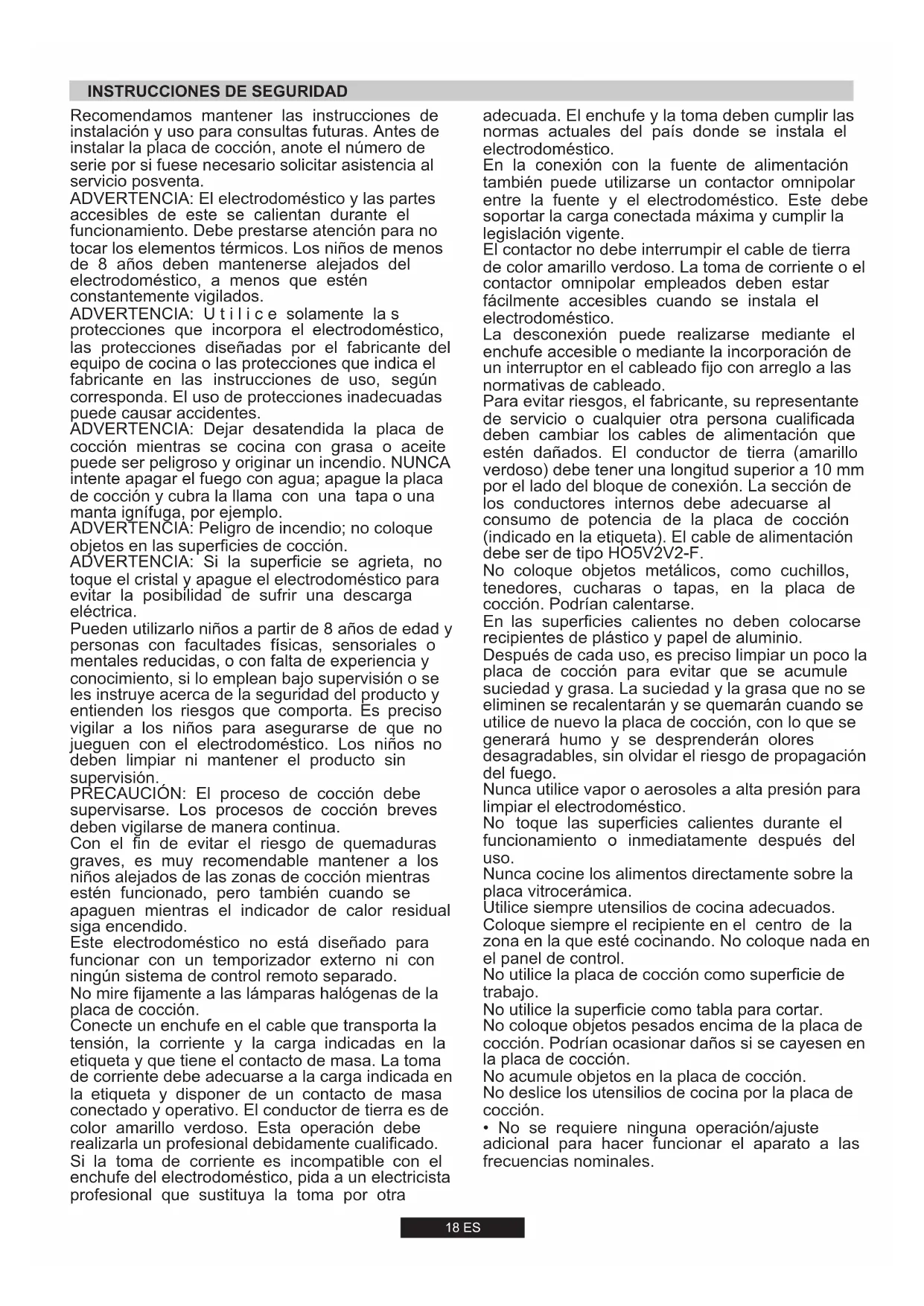 7,7 kW734 l/h560 g/h -18 ES Este electrodoméstico no está diseñado para funcionar con un temporizador externo ni con ningún sistema de control remoto separado. ADVERTENCIA: El electrodoméstico y las partes accesibles de este se calientan durante el funcionamiento. Debe prestarse atención para no tocar los elementos térmicos. Los niños de menos de 8 años deben mantenerse alejados del electrodoméstico, a menos que estén constantemente vigilados. ADVERTENCIA: Dejar desatendida la placa de cocción mientras se cocina con grasa o aceite puede ser peligroso y originar un incendio. NUNCA intente apagar el fuego con agua; apague la placa de cocción y cubra la llama con una tapa o una manta ignífuga, por ejemplo. ADVERTENCIA: Si la superficie se agrieta, no toque el cristal y apague el electrodoméstico para evitar la posibilidad de sufrir una descarga eléctrica. PRECAUCIÓN: El proceso de cocción debe supervisarse. Los procesos de cocción breves deben vigilarse de manera continua. No mire fijamente a las lámparas halógenas de la placa de cocción. Con el fin de evitar el riesgo de quemaduras graves, es muy recomendable mantener a los niños alejados de las zonas de cocción mientras estén funcionado, pero también cuando se apaguen mientras el indicador de calor residual siga encendido. ADVERTENCIA: U t i l i c e solamente la s protecciones que incorpora el electrodoméstico, las protecciones diseñadas por el fabricante del equipo de cocina o las protecciones que indica el fabricante en las instrucciones de uso, según corresponda. El uso de protecciones inadecuadas puede causar accidentes. ADVERTENCIA: Peligro de incendio; no coloque objetos en las superficies de cocción. Pueden utilizarlo niños a partir de 8 años de edad y personas con facultades físicas, sensoriales o mentales reducidas, o con falta de experiencia y conocimiento, si lo emplean bajo supervisión o se les instruye acerca de la seguridad del producto y entienden los riesgos que comporta. Es preciso vigilar a los niños para asegurarse de que no jueguen con el electrodoméstico. Los niños no deben limpiar ni mantener el producto sin supervisión. Recomendamos mantener las instrucciones de instalación y uso para consultas futuras. Antes de instalar la placa de cocción, anote el número de serie por si fuese necesario solicitar asistencia al servicio posventa. Conecte un enchufe en el cable que transporta la tensión, la corriente y la carga indicadas en la etiqueta y que tiene el contacto de masa. La toma de corriente debe adecuarse a la carga indicada en la etiqueta y disponer de un contacto de masa conectado y operativo. El conductor de tierra es de color amarillo verdoso. Esta operación debe realizarla un profesional debidamente cualificado. Si la toma de corriente es incompatible con el enchufe del electrodoméstico, pida a un electricista profesional que sustituya la toma por otra