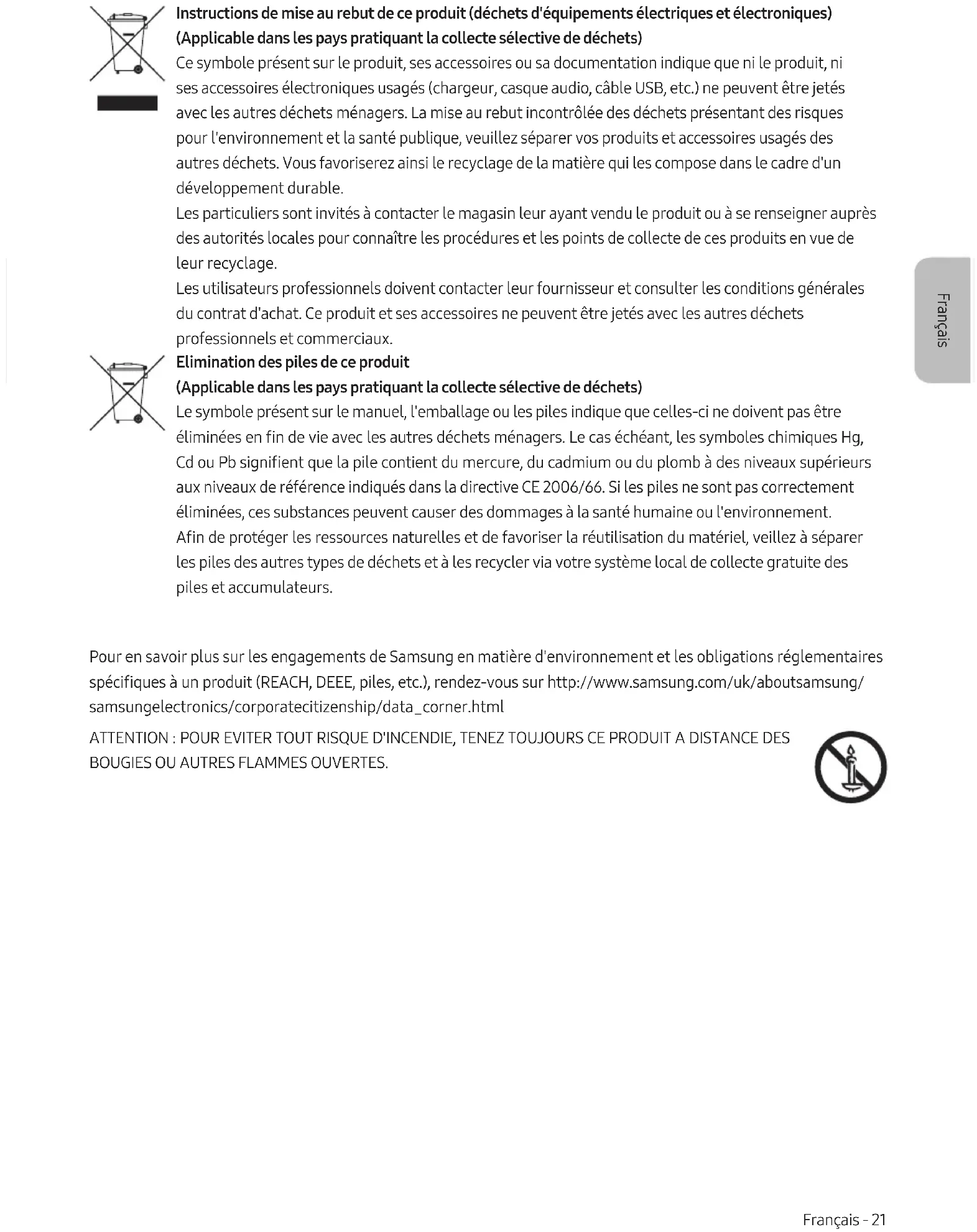 - El consumo de energía normal se mide de acuerdo con IEC 62087. Español - 19 EspañolReducción del consumo de energía El televisor entra en modo de espera cuando lo apaga. Cuando está en modo de espera, sigue consumiendo una pequeña cantidad de energía. Para reducir el consumo de energía, desenchufe el cable de alimentación si no tiene intención de utilizarlo durante un periodo largo. Licencias The terms HDMI and HDMI High-Denition Multimedia Interface, and the HDMI Logo are trademarks or registered trademarks of HDMI Licensing LLC in the United States and other countries. Recomendación - Solo UE Por el presente documento Samsung Electronics declara que este televisor cumple con los requisitos esenciales y otras disposiciones relevantes de la Directiva 1999/5/CE. La Declaración de conformidad ocial se puede encontrar en http://www.samsung.com/es. Vaya a Atención al Cliente > Encontrar e introduzca el modelo. Este equipo solo se debe utilizar en interiores. Este equipo puede funcionar en todos los países de la UE. Español - 20Correcta eliminación del producto (desechos de equipos eléctricos y electrónicos) (Aplicable en países con sistemas de recogida selectiva) Esta marca en el producto, los accesorios o la documentación indica que el producto y los accesorios electrónicos (como cargador, auriculares, cable USB) no se deben desechar junto al resto de la basura doméstica. Para prevenir posibles daños al entorno ambiental o a las personas por una eliminación incontrolada, cuando decida desprenderse del aparato debe acudir a un centro de reciclaje donde se promueva la reutilización sostenible de los recursos materiales. Los usuarios particulares pueden ponerse en contacto con el centro donde adquirieron el aparato o con alguna ocina municipal donde le informarán de dónde debe depositar el electrodoméstico para su reciclaje. Los comerciantes deben ponerse en contacto con el distribuidor y comprobar los términos y las condiciones del contrato de compra. Este producto y sus accesorios electrónicos no se deben mezclar con otros deshechos comerciales para su eliminación. Correcta eliminación de las pilas de este producto (Aplicable en países con sistemas de recogida selectiva) Esta marca en las pilas, el manual o el embalaje indica que las pilas de este producto no se deben desechar junto con los residuos domésticos al término de su vida útil. Cuando está indicado, los símbolos químicos Hg, Cd o Pb indican que las pilas contienen mercurio, cadmio o plomo que superan los niveles de referencia de la directiva CE 2006/66. Si las pilas no se eliminan adecuadamente, estas sustancias pueden causar daños a la salud humana y al medio ambiente. Para proteger los recursos naturales y promover la reutilización de los materiales, separe la pilas de otros tipos de basura doméstica y recíclelas en su sistema local de recogida gratuita de pilas. Para obtener información sobre los compromisos medioambientales y las obligaciones legales de algún producto especíco de Samsung, como por ejemplo REACH, WEEE o las pilas, visite http://www.samsung.com/uk/ aboutsamsung/samsungelectronics/corporatecitizenship/data_corner.html ADVERTENCIA - PARA IMPEDIR QUE EL FUEGO SE PROPAGUE, MANTENGA EN TODO MOMENTO LA LLAMA DE LAS VELAS O DE OTROS OBJETOS LEJOS DE ESTE PRODUCTO. Español - 21 Español© 2017 Samsung Electronics Co., Ltd. All rights reserved. Contact SAMSUNG WORLD WIDE If you have any questions or comments relating to Samsung products, please contact the SAMSUNG customer care centre. Country Customer Care Centre Web Site AUSTRIA 0800-SAMSUNG (0800-7267864) [Only for Dealers] 0810-112233 www.samsung.com/at/support BELGIUM 02-201-24-18 www.samsung.com/be/support (Dutch) www.samsung.com/be_fr/support (French) BOSNIA 055 233 999 www.samsung.com/support BULGARIA *3000 Цена в мрежата 0800 111 31, Безплатна телефонна линия www.samsung.com/bg/support CROATIA 072 726 786 www.samsung.com/hr/support CZECH 800 - SAMSUNG (800-726786) www.samsung.com/cz/support Samsung Electronics Czech and Slovak, s.r.o. V Parku 2323/14, 148 00 - Praha 4 DENMARK 70 70 19 70 www.samsung.com/dk/support FINLAND 030-6227 515 www.samsung.com/fi/support FRANCE 01 48 63 00 00 www.samsung.com/fr/support GERMANY 0180 6 SAMSUNG bzw. 0180 6 7267864* (*0,20 €/Anruf aus dem dt. Festnetz, aus dem Mobilfunk max. 0,60 €/Anruf) www.samsung.com/de/support CYPRUS 8009 4000 only from landline, toll free www.samsung.com/gr/support GREECE 80111-SAMSUNG (80111 726 7864) only from land line (+30) 210 6897691 from mobile and land line HUNGARY 0680SAMSUNG (0680-726-786) 0680PREMIUM (0680-773-648) www.samsung.com/hu/support ITALIA 800-SAMSUNG (800.7267864) www.samsung.com/it/support LUXEMBURG 261 03 710 www.samsung.com/be_fr/support MONTENEGRO 020 405 888 www.samsung.com/support SLOVENIA 080 697 267 (brezplačna številka) www.samsung.com/si/support NETHERLANDS 088 90 90 100 www.samsung.com/nl/support NORWAY 815 56480 www.samsung.com/no/support POLAND 801-172-678* lub +48 22 607-93-33*