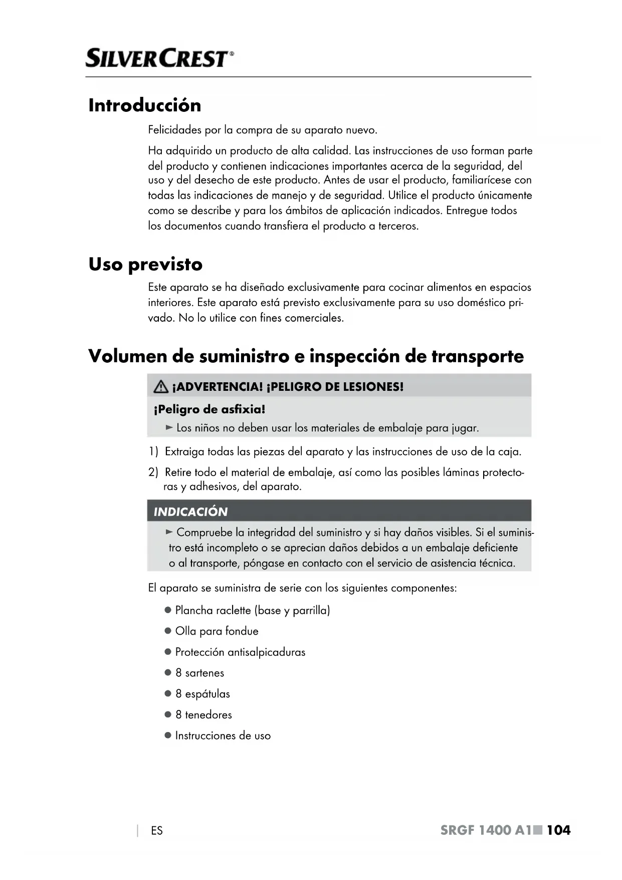 ES Introducción Felicidades por la compra de su aparato nuevo. Ha adquirido un producto de alta calidad. Las instrucciones de uso forman parte del producto y contienen indicaciones importantes acerca de la seguridad, del uso y del desecho de este producto. Antes de usar el producto, familiarícese con todas las indicaciones de manejo y de seguridad. Utilice el producto únicamente como se describe y para los ámbitos de aplicación indicados. Entregue todos los documentos cuando transfiera el producto a terceros. Uso previsto Este aparato se ha diseñado exclusivamente para cocinar alimentos en espacios interiores. Este aparato está previsto exclusivamente para su uso doméstico pri- vado. No lo utilice con fines comerciales. Volumen de suministro e inspección de transporte ¡ADVERTENCIA! ¡PELIGRO DE LESIONES! ¡Peligro de asfixia! ► Los niños no deben usar los materiales de embalaje para jugar.