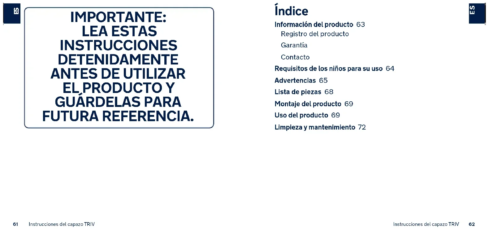 Índice Información del producto 63 Registro del producto Garantía Contacto Requisitos de los niños para su uso 64 Advertencias 65 Lista de piezas 68 Montaje del producto 69 Uso del producto 69 Limpieza y mantenimiento 72 IMPORTANTE: LEA ESTAS INSTRUCCIONES DETENIDAMENTE