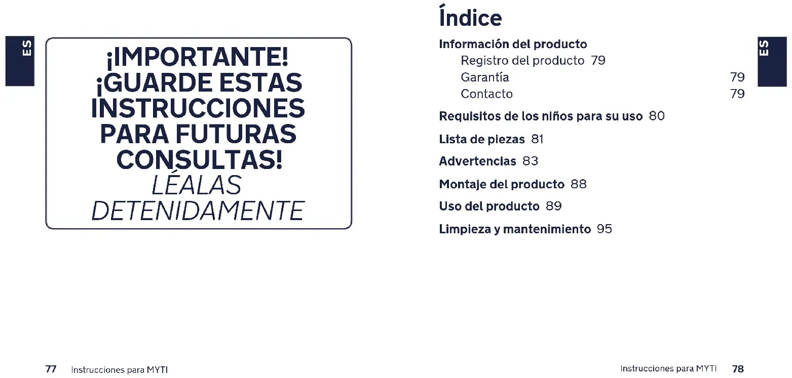 ¡IMPORTANTE! ¡GUARDE ESTAS INSTRUCCIONES PARA FUTURAS CONSULTAS! LÉALAS DETENIDAMENTE Índice Información del producto Registro del producto 79 Garantía 79 Contacto 79 Requisitos de los niños para su uso 80 Lista de piezas 81 Advertencias 83 Montaje del producto 88 Uso del producto 89 Limpieza y mantenimiento 9579 Instrucciones para MYTI Instrucciones para MYTI