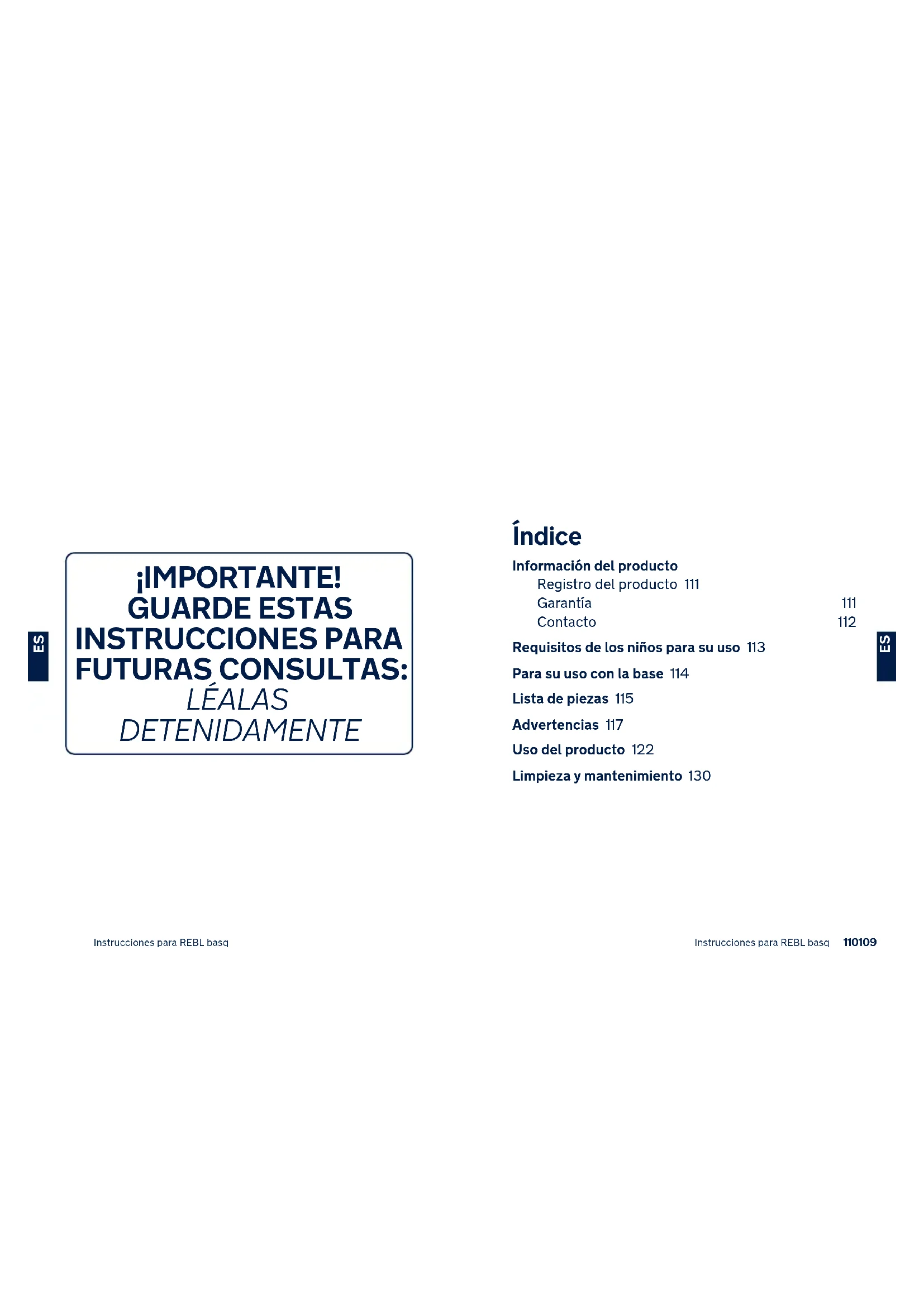 Índice Información del producto Registro del producto 111 Garantía 111 Contacto 112 Requisitos de los niños para su uso 113 Para su uso con la base 114 Lista de piezas 115 Advertencias 117 Uso del producto 122 Limpieza y mantenimiento 130 ¡IMPORTANTE! GUARDE ESTAS INSTRUCCIONES PARA FUTURAS CONSULTAS: LÉALAS DETENIDAMENTE112111 Instrucciones para REBL basq Instrucciones para REBL basq