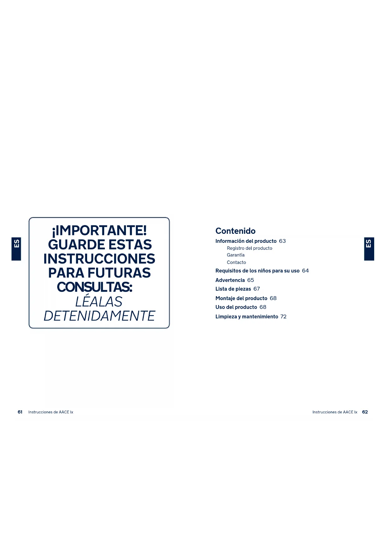 Istruzioni AACE lx Istruzioni AACE lxContenido Información del producto 63 Registro del producto Garantía Contacto Requisitos de los niños para su uso 64 Advertencia 65 Lista de piezas 67 Montaje del producto 68 Uso del producto 68 Limpieza y mantenimiento 72 ¡IMPORTANTE! GUARDE ESTAS INSTRUCCIONES PARA FUTURAS CONSULTAS: LÉALAS DETENIDAMENTE
