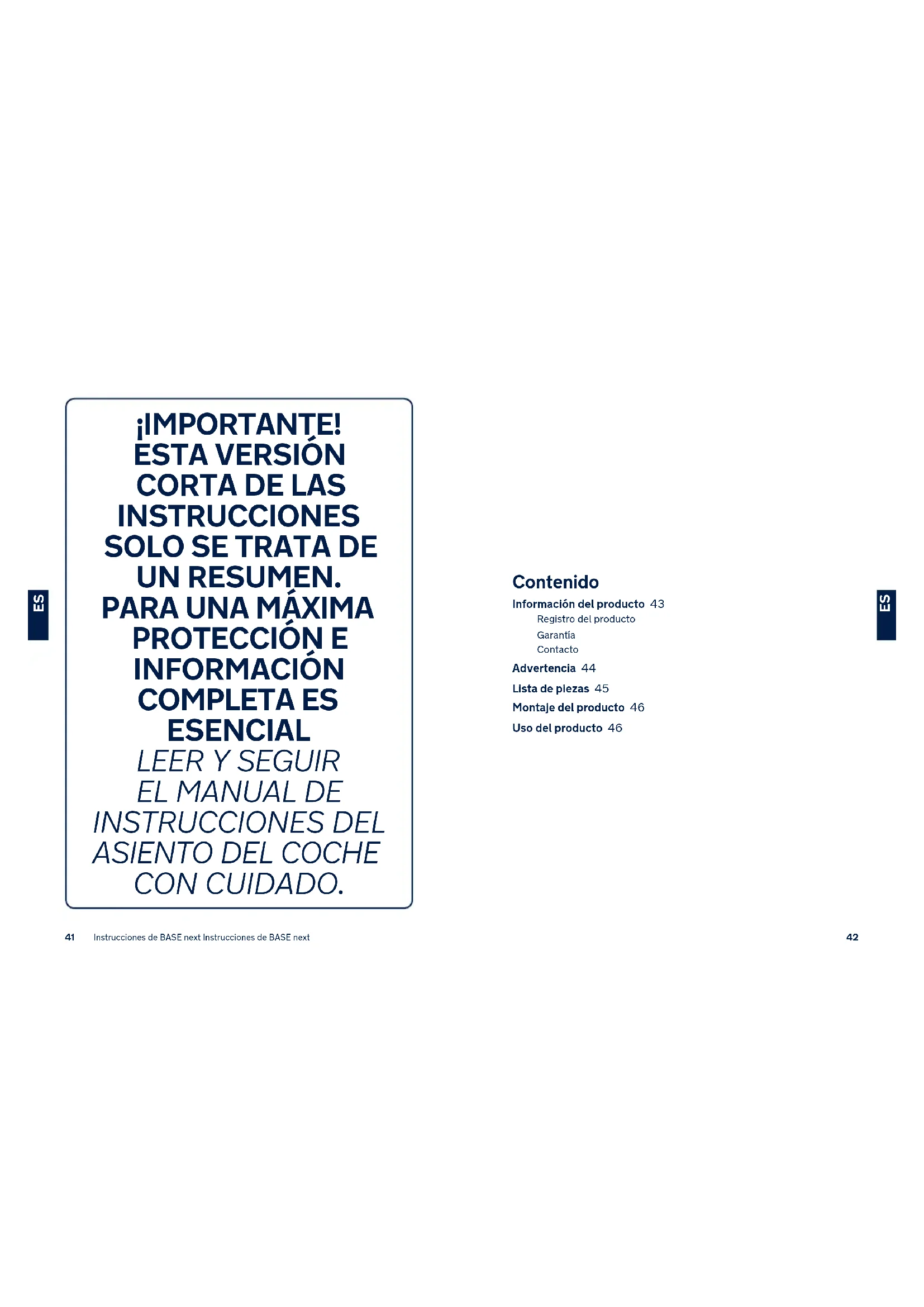 Instrucciones de BASE next Instrucciones de BASE next Contenido Información del producto 43 Registro del producto Garantía Contacto Advertencia 44 Lista de piezas 45 Montaje del producto 46 Uso del producto 46 ¡IMPORTANTE!
