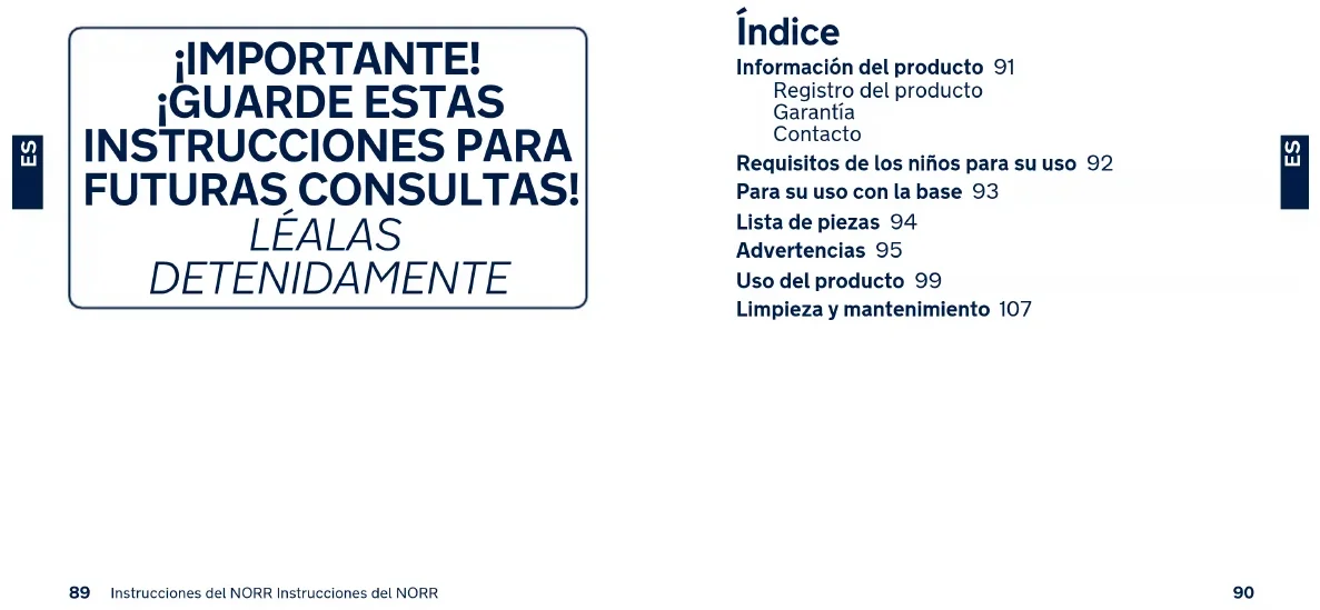 IT¡IMPORTANTE! ¡GUARDE ESTAS INSTRUCCIONES PARA FUTURAS CONSULTAS! LÉALAS DETENIDAMENTE Índice Información del producto 91 Registro del producto Garantía Contacto Requisitos de los niños para su uso 92 Para su uso con la base 93 Lista de piezas 94 Advertencias 95 Uso del producto 99 Limpieza y mantenimiento 107