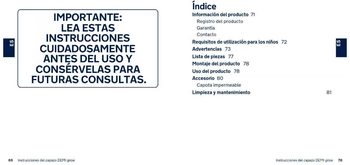 FUTURAS CONSULTAS. Índice Información del producto 71 Registro del producto Garantía Contacto Requisitos de utilización para los niños 72 Advertencias 73 Lista de piezas 77 Montaje del producto 78 Uso del producto 78 Accesorio 80 Capota impermeable Limpieza y mantenimiento 8171 Instrucciones del capazo DEMI grow 72Instrucciones del capazo DEMI grow