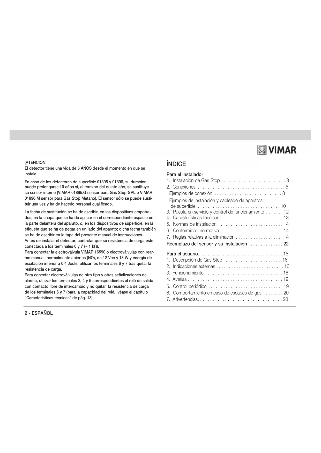 , es posible entregar gratuitamente, sin obligación de compra, los productos que se deben eliminar con unas dimensiones inferiores a 25 cm. La recogida se- lectiva adecuada para proceder posteriormente al reciclaje, al tratamiento y a la eliminación del aparato de manera compatible con el medio ambien- te contribuye a evitar posibles efectos negativos en el medio ambiente y en la salud y favorece la reutilización y/o el reciclaje de los materiales de los que se compone el aparato.ESPAÑOL - 15 Para el usuario ¡ATENCIÓN! El detector que usted ha comprado es un producto tecnológi- camente avanzado, proyectado y realizado según las normas técnicas vigentes y las directivas CE. El detector tiene una vida de 5 AÑOS desde el momento en que se instala. En caso de los detectores de superficie 01895 y 01896, su dura- ción puede prolongarse 10 años si, al término del quinto año, se sustituye su sensor interno (VIMAR 01895.G sensor para Gas Stop GPL o VIMAR 01896.M sensor para Gas Stop Metano). El sensor sólo se puede sustituir una vez y ha de hacerlo personal cualificado (veáse pag. 2). Leer atentamente las instrucciones del usuario. Recuérdese de contactar con su instalador antes de la fecha de caducidad del producto para que lo sustituya. Cuando el instalador ponga en marcha el aparato, tiene que indicar su fecha de caducidad utilizando la correspondiente chapa/etiqueta.