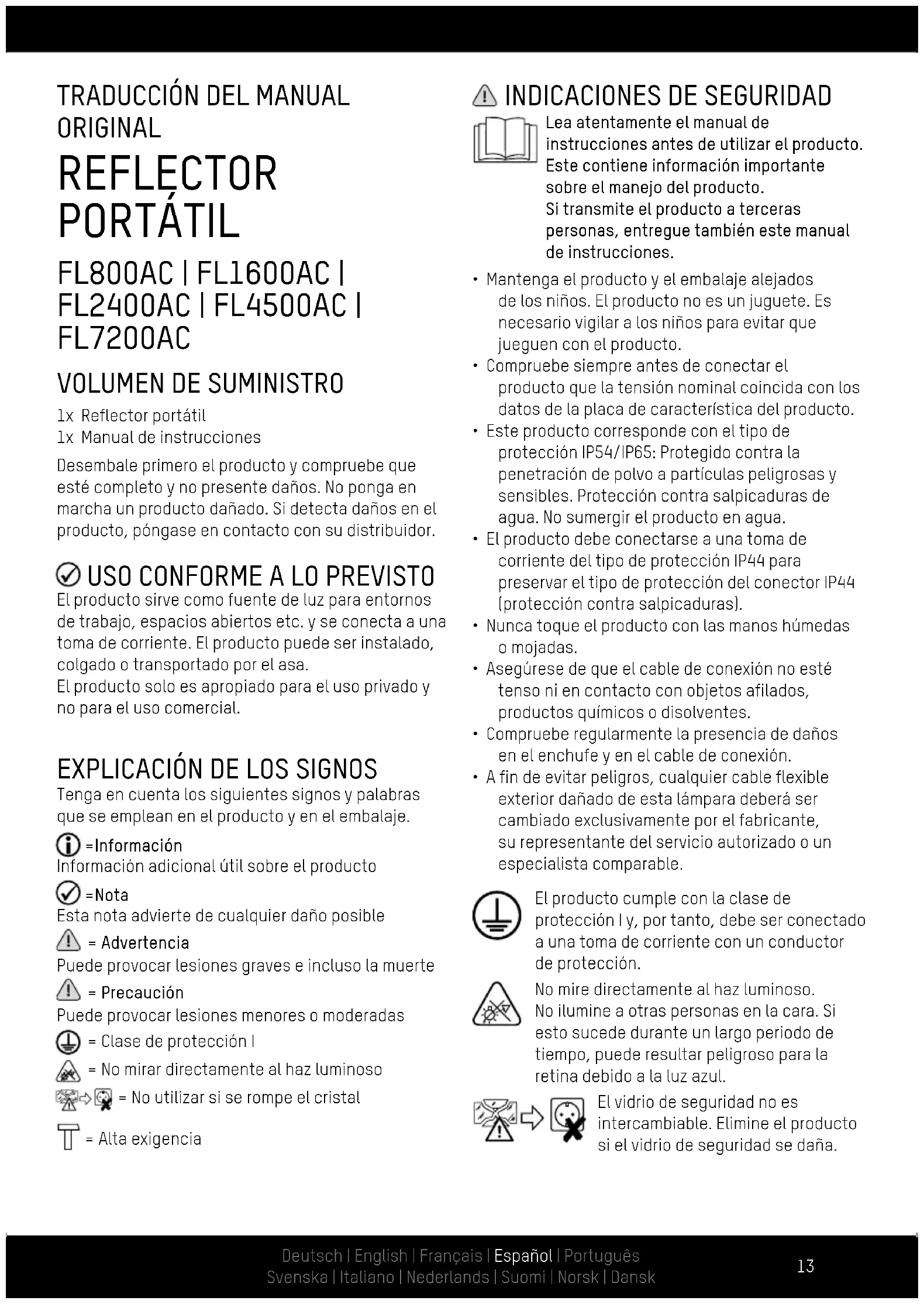 - A fin de evitar peligros, cualquier cable flexible exterior dañado de esta lámpara deberá ser cambiado exclusivamente por el fabricante, su representante del servicio autorizado o un especialista comparable. El producto cumple con la clase de protección I y, por tanto, debe ser conectado a una toma de corriente con un conductor de protección. No mire directamente al haz luminoso. No ilumine a otras personas en la cara. Si esto sucede durante un largo periodo de tiempo, puede resultar peligroso para la retina debido a la luz azul. El vidrio de seguridad no es intercambiable. Elimine el producto si el vidrio de seguridad se daña.Deutsch | English | Français | Español | Português Svenska | Italiano | Nederlands | Suomi | Norsk | Dansk Deutsch | English | Français | Español | Português Svenska | Italiano | Nederlands | Suomi | Norsk | Dansk