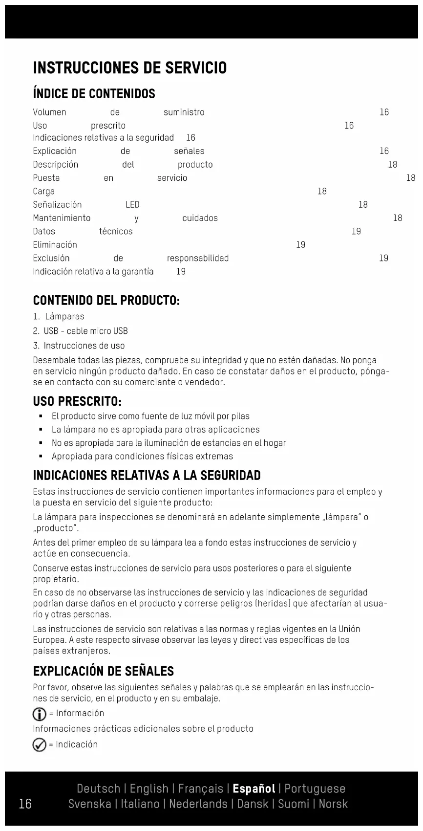 Por favor, observe las siguientes señales y palabras que se emplearán en las instruccio- nes de servicio, en el producto y en su embalaje. = Información Informaciones prácticas adicionales sobre el producto = Indicación Volumen de suministro 16 Uso prescrito 16 Indicaciones relativas a la seguridad 16 Explicación de señales 16 Descripción del producto 18 Puesta en servicio 18 Carga 18 Señalización LED 18 Mantenimiento y cuidados 18 Datos técnicos 19 Eliminación 19 Exclusión de responsabilidad 19 Indicación relativa a la garantía 19 Deutsch | English | Français | Español | Portuguese Svenska | Italiano | Nederlands | Dansk | Suomi | Norsk Deutsch | English | Français | Español | Portuguese Svenska | Italiano | Nederlands | Dansk | Suomi | Norsk17 Esta indicación avisa de posibles daños de todo tipo = Aviso ¡Atención, peligro! Puede tener como consecuencia heridas graves o la muerte ¡OBSERVE LAS INSTRUCCIONES DE SEGURIDAD! Evitar las heridas de los ojos; no mirar directamente en el haz de luz ni alumbrar el rostro de otras personas. Si esto sucediera prolongadamente, podría ponerse en peligro la re- tina por causa de la porción de luz azul. Caso que un haz de luz incida en los ojos, deben cerrarse los ojos y apartarse la cabeza del haz de luz. Esta lámpara sobrepasa las condiciones para el empleo sin riesgos. El riesgo en el uso depende del modo en que el usuario maneje la linterna. (1) Este valor indica el factor en el que se sobrepasa el valor de grupo de riesgo respecto del siguiente grupo inferior. El valor límite es de 1. (2) La distancia del ojo respecto de la lámpara, a la cual se adscribe el grupo de riesgo correspondiente. Grupo de riesgo 2 Valor de peligrosidad en la exposición / Exposure Hazard Value (EHV)(1): 12 Grupo de riesgo Distancia de peligrosidad / Hazard Distance (HD) (2) 2 de 0 m a 0.7m 1 de 0.7m a 7m Grupo libre > 7 m § Las indicaciones relativas a la lámpara, el bloque de alimentación así como la tensión de red de la toma de corriente deben coincidir con lo indicado en la placa de tipo. § En caso de daños de la carcasa, el conector, el cable o el bloque de alimentación, no ponga en funcionamiento el producto. Póngase en contacto con un comercio especializado autorizado o diríjase a la dirección de servicio del fabricante. § ¡No abrir ni modificar el dispositivo! Las reparaciones y el cambio de acumulador solo deben ser llevados a cabo por el fabricante o por un técnico de servicio por él encargado o por una persona cualificada de modo semejante. § Mantenga a los niños alejados del producto y de su embalaje. El producto no es un juguete. Los niños deben estar vigilados para garantizarse que no jueguen con el producto. § Este dispositivo no está destinado a ser utilizado por personas (incluidos niños) con facultades físicas, sensoriales o mentales disminuidas o que tengan poca experien- cia y poco conocimiento en el manejo de este dispositivo. ¡Estas personas deben haber sido instruidas primero por una persona supervisora y que sea responsable de su seguridad o las supervise durante el manejo del producto! § La bombilla LED no es substituible; cuando concluya la vida útil del LED, deberá substituirse la lámpara completa § ¡Todos los objetos iluminados deben encontrarse mínimamente a 10 cm de la lámpa- ra! § La lámpara solamente debe emplearse para el uso prescrito. § El producto no es apropiado para jugar. § ¡Guardar el producto fuera del alcance de los niños! § ¡No respetar las instrucciones de seguridad puede producir daños en el dispositivo o lesiones peligrosas en las personas! § Mantenga el producto siempre seco Deutsch | English | Français | Español | Portuguese Svenska | Italiano | Nederlands | Dansk | Suomi | Norsk18 ATENCIÓN: § El producto contiene un acumulador no substituible de iones de litio. ¡No arroje el producto nunca al fuego! § El producto solamente debe cargarse en estancias cerradas, secas, amplias y alejadas de materiales inflamables y líquidos. La no observación puede tener como consecuencia quemaduras e incendios. § El acumulador nunca debe abrirse, aplastarse, calentarse o quemarse. § No emplear el producto en un entorno susceptible de explosiones ni bajo la lluvia ni exponerlo a un calor excesivo. § No emplear el producto si aparenta encontrarse dañado DESCRIPCIÓN DEL PRODUCTO:
