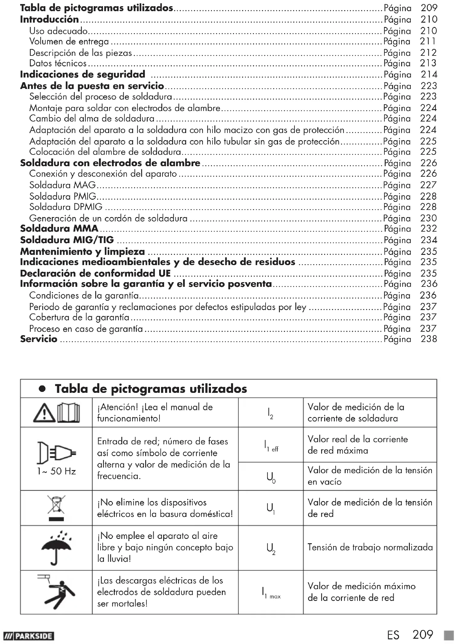 Inhalar el humo de la soldadura puede ser nocivo para su salud. ¡Cuidado! ¡Peligro de descarga eléctrica! Las chispas de soldadura pueden provocar una explosión o un incendio. ¡Nota importante! Las radiaciones del arco eléctrico pueden provocar lesiones oculares y cutáneas. ¡Elimine el embalaje y el aparato de forma respetuosa con el medio ambiente!