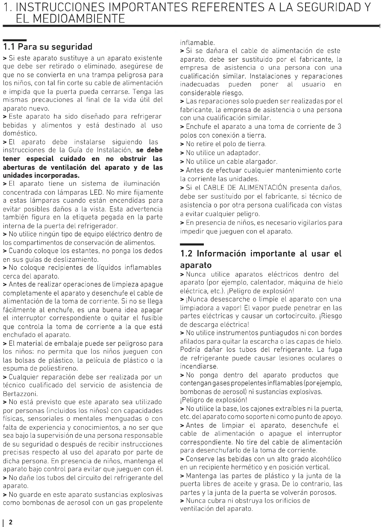 > Si este aparato sustituye a un aparato existente que debe ser retirado o eliminado, asegúrese de que no se convierta en una trampa peligrosa para los niños, con tal fin corte su cable de alimentación e impida que la puerta pueda cerrarse. Tenga las mismas precauciones al final de la vida útil del aparato nuevo. > Este aparato ha sido diseñado para refrigerar bebidas y alimentos y está destinado al uso doméstico. > El aparato debe instalarse siguiendo las instrucciones de la Guía de Instalación, se debe tener especial cuidado en no obstruir las aberturas de ventilación del aparato y de las unidades incorporadas. > El aparato tiene un sistema de iluminación concentrada con lámparas LED. No mire fijamente a estas lámparas cuando están encendidas para evitar posibles daños a la vista. Esta advertencia también figura en la etiqueta pegada en la parte interna de la puerta del refrigerador. > No utilice ningún tipo de equipo eléctrico dentro de los compartimentos de conservación de alimentos. > Cuando coloque los estantes, no ponga los dedos en sus guías de deslizamiento. > No coloque recipientes de líquidos inflamables cerca del aparato. > Antes de realizar operaciones de limpieza apague completamente el aparato y desenchufe el cable de alimentación de la toma de corriente. Si no se llega fácilmente al enchufe, es una buena idea apagar el interruptor correspondiente o quitar el fusible que controla la toma de corriente a la que está enchufado el aparato. > El material de embalaje puede ser peligroso para los niños: no permita que los niños jueguen con las bolsas de plástico, la película de plástico o la espuma de poliestireno. > Cualquier reparación debe ser realizada por un técnico cualificado del servicio de asistencia de Bertazzoni. > No está previsto que este aparato sea utilizado por personas (incluidos los niños) con capacidades físicas, sensoriales o mentales menguadas o con falta de experiencia y conocimientos, a no ser que sea bajo la supervisión de una persona responsable de su seguridad o después de recibir instrucciones precisas respecto al uso del aparato por parte de dicha persona. En presencia de niños, mantenga el aparato bajo control para evitar que jueguen con él. > No dañe los tubos del circuito del refrigerante del aparato. > No guarde en este aparato sustancias explosivas como bombonas de aerosol con un gas propelente inflamable. > Si se dañara el cable de alimentación de este aparato, debe ser sustituido por el fabricante, la empresa de asistencia o una persona con una cualificación similar. Instalaciones y reparaciones inadecuadas pueden poner al usuario en considerable riesgo. > Las reparaciones solo pueden ser realizadas por el fabricante, la empresa de asistencia o una persona con una cualificación similar. > Enchufe el aparato a una toma de corriente de 3 polos con conexión a tierra. > No retire el polo de tierra. > No utilice un adaptador. > No utilice un cable alargador. > Antes de efectuar cualquier mantenimiento corte la corriente las unidades. > Si el CABLE DE ALIMENTACIÓN presenta daños, debe ser sustituido por el fabricante, si técnico de asistencia o por otra persona cualificada con vistas a evitar cualquier peligro. > En presencia de niños, es necesario vigilarlos para impedir que jueguen con el aparato.