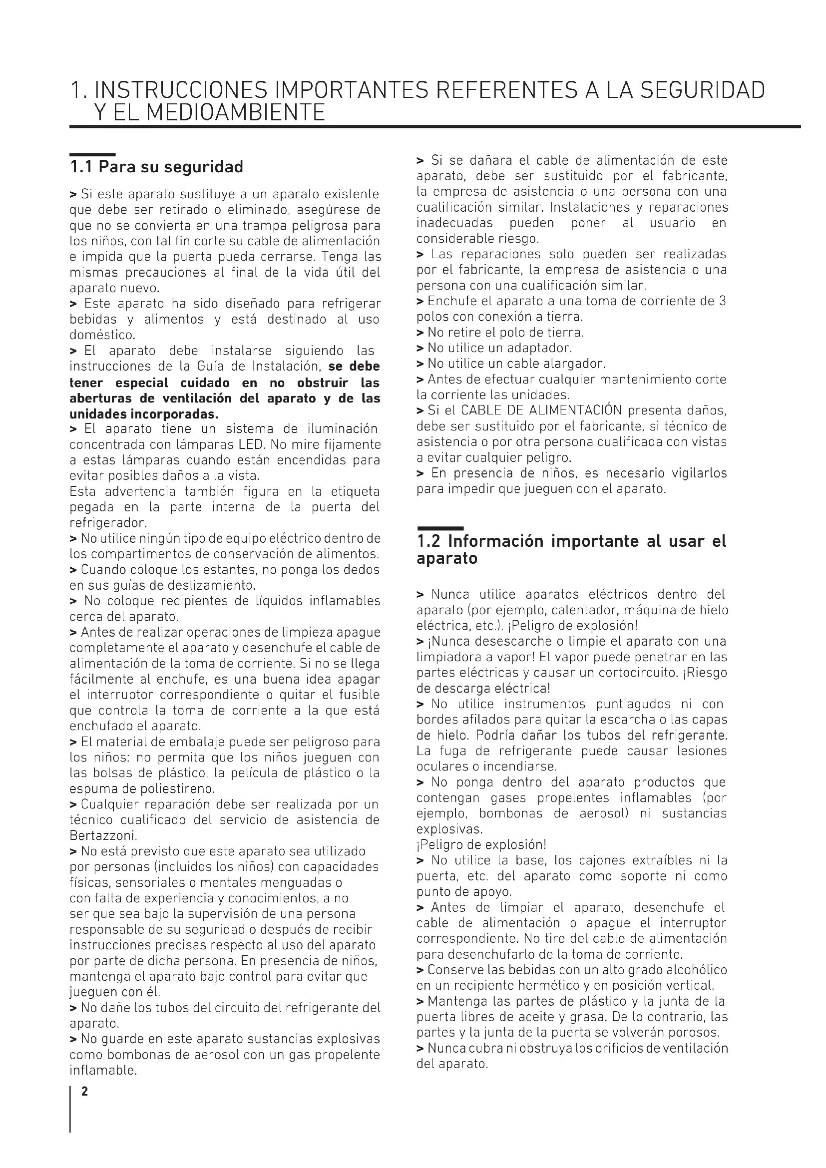> Si este aparato sustituye a un aparato existente que debe ser retirado o eliminado, asegúrese de que no se convierta en una trampa peligrosa para los niños, con tal fin corte su cable de alimentación e impida que la puerta pueda cerrarse. Tenga las mismas precauciones al final de la vida útil del aparato nuevo. > Este aparato ha sido diseñado para refrigerar bebidas y alimentos y está destinado al uso doméstico. > El aparato debe instalarse siguiendo las instrucciones de la Guía de Instalación, se debe tener especial cuidado en no obstruir las aberturas de ventilación del aparato y de las unidades incorporadas. > El aparato tiene un sistema de iluminación concentrada con lámparas LED. No mire fijamente a estas lámparas cuando están encendidas para evitar posibles daños a la vista. Esta advertencia también figura en la etiqueta pegada en la parte interna de la puerta del refrigerador. > No utilice ningún tipo de equipo eléctrico dentro de los compartimentos de conservación de alimentos. > Cuando coloque los estantes, no ponga los dedos en sus guías de deslizamiento. > No coloque recipientes de líquidos inflamables cerca del aparato. > Antes de realizar operaciones de limpieza apague completamente el aparato y desenchufe el cable de alimentación de la toma de corriente. Si no se llega fácilmente al enchufe, es una buena idea apagar el interruptor correspondiente o quitar el fusible que controla la toma de corriente a la que está enchufado el aparato. > El material de embalaje puede ser peligroso para los niños: no permita que los niños jueguen con las bolsas de plástico, la película de plástico o la espuma de poliestireno. > Cualquier reparación debe ser realizada por un técnico cualificado del servicio de asistencia de Bertazzoni. > No está previsto que este aparato sea utilizado por personas (incluidos los niños) con capacidades físicas, sensoriales o mentales menguadas o con falta de experiencia y conocimientos, a no ser que sea bajo la supervisión de una persona responsable de su seguridad o después de recibir instrucciones precisas respecto al uso del aparato por parte de dicha persona. En presencia de niños, mantenga el aparato bajo control para evitar que jueguen con él. > No dañe los tubos del circuito del refrigerante del aparato. > No guarde en este aparato sustancias explosivas como bombonas de aerosol con un gas propelente inflamable. > Si se dañara el cable de alimentación de este aparato, debe ser sustituido por el fabricante, la empresa de asistencia o una persona con una cualificación similar. Instalaciones y reparaciones inadecuadas pueden poner al usuario en considerable riesgo. > Las reparaciones solo pueden ser realizadas por el fabricante, la empresa de asistencia o una persona con una cualificación similar. > Enchufe el aparato a una toma de corriente de 3 polos con conexión a tierra. > No retire el polo de tierra. > No utilice un adaptador. > No utilice un cable alargador. > Antes de efectuar cualquier mantenimiento corte la corriente las unidades. > Si el CABLE DE ALIMENTACIÓN presenta daños, debe ser sustituido por el fabricante, si técnico de asistencia o por otra persona cualificada con vistas a evitar cualquier peligro. > En presencia de niños, es necesario vigilarlos para impedir que jueguen con el aparato.