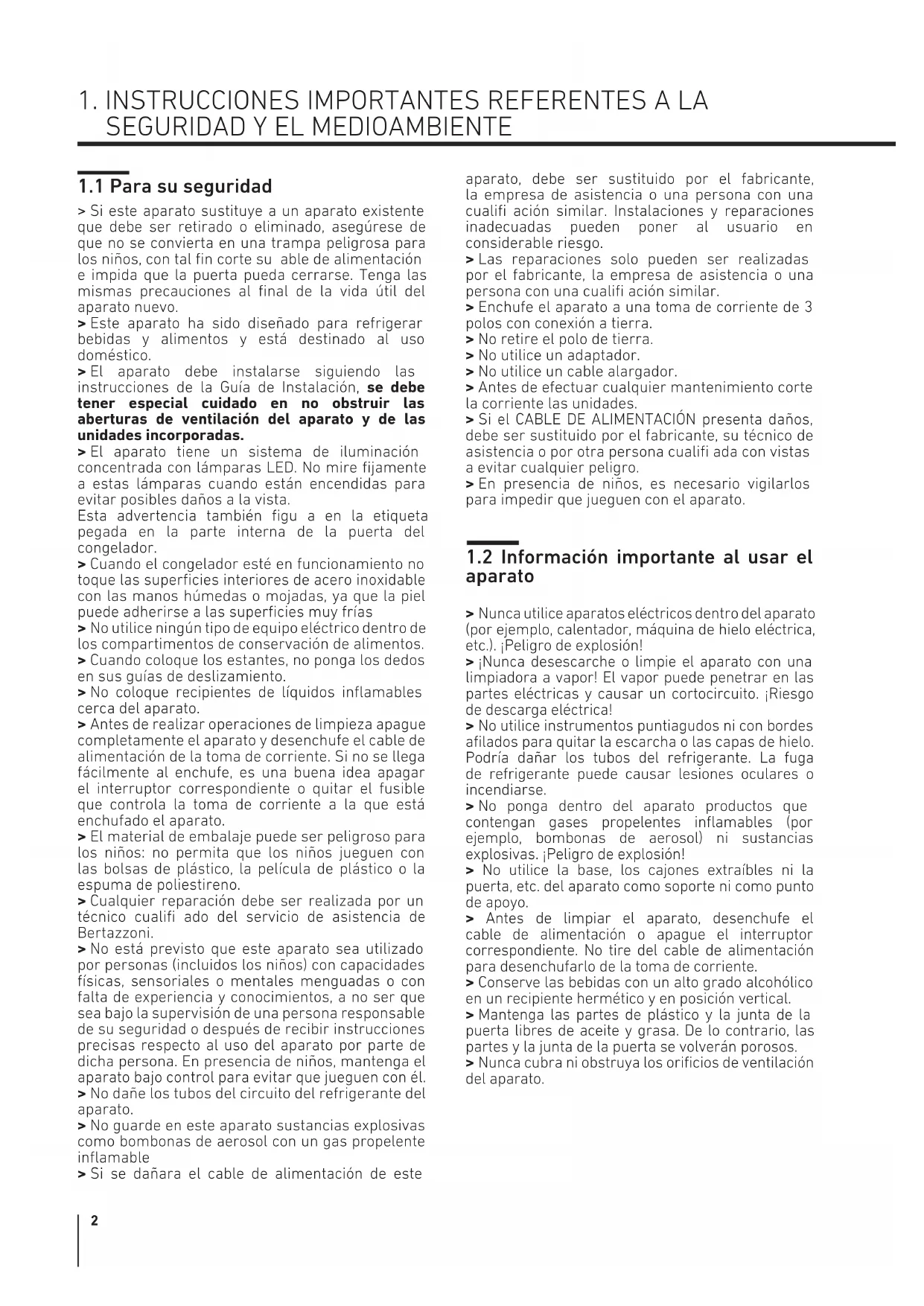 > Si este aparato sustituye a un aparato existente que debe ser retirado o eliminado, asegúrese de que no se convierta en una trampa peligrosa para los niños, con tal fin corte su able de alimentación e impida que la puerta pueda cerrarse. Tenga las mismas precauciones al final de la vida útil del aparato nuevo. > Este aparato ha sido diseñado para refrigerar bebidas y alimentos y está destinado al uso doméstico. > El aparato debe instalarse siguiendo las instrucciones de la Guía de Instalación, se debe tener especial cuidado en no obstruir las aberturas de ventilación del aparato y de las unidades incorporadas > El aparato tiene un sistema de iluminación concentrada con lámparas LED. No mire fijamente a estas lámparas cuando están encendidas para evitar posibles daños a la vista. Esta advertencia también figu a en la etiqueta pegada en la parte interna de la puerta del congelador. > Cuando el congelador esté en funcionamiento no toque las superficies interiores de acero inoxidable con las manos húmedas o mojadas, ya que la piel puede adherirse a las superficies muy frías > No utilice ningún tipo de equipo eléctrico dentro de los compartimentos de conservación de alimentos. > Cuando coloque los estantes, no ponga los dedos en sus guías de deslizamiento. > No coloque recipientes de líquidos inflamables cerca del aparato. > Antes de realizar operaciones de limpieza apague completamente el aparato y desenchufe el cable de alimentación de la toma de corriente. Si no se llega fácilmente al enchufe, es una buena idea apagar el interruptor correspondiente o quitar el fusible que controla la toma de corriente a la que está enchufado el aparato. > El material de embalaje puede ser peligroso para los niños: no permita que los niños jueguen con las bolsas de plástico, la película de plástico o la espuma de poliestireno. > Cualquier reparación debe ser realizada por un técnico cualifi ado del servicio de asistencia de Bertazzoni. > No está previsto que este aparato sea utilizado por personas (incluidos los niños) con capacidades físicas, sensoriales o mentales menguadas o con falta de experiencia y conocimientos, a no ser que sea bajo la supervisión de una persona responsable de su seguridad o después de recibir instrucciones precisas respecto al uso del aparato por parte de dicha persona. En presencia de niños, mantenga el aparato bajo control para evitar que jueguen con él. > No dañe los tubos del circuito del refrigerante del aparato. > No guarde en este aparato sustancias explosivas como bombonas de aerosol con un gas propelente inflamable > Si se dañara el cable de alimentación de este aparato, debe ser sustituido por el fabricante, la empresa de asistencia o una persona con una cualifi ación similar. Instalaciones y reparaciones inadecuadas pueden poner al usuario en considerable riesgo. > Las reparaciones solo pueden ser realizadas por el fabricante, la empresa de asistencia o una persona con una cualifi ación similar. > Enchufe el aparato a una toma de corriente de 3 polos con conexión a tierra. > No retire el polo de tierra. > No utilice un adaptador. > No utilice un cable alargador. > Antes de efectuar cualquier mantenimiento corte la corriente las unidades. > Si el CABLE DE ALIMENTACIÓN presenta daños, debe ser sustituido por el fabricante, su técnico de asistencia o por otra persona cualifi ada con vistas a evitar cualquier peligro. > En presencia de niños, es necesario vigilarlos para impedir que jueguen con el aparato.