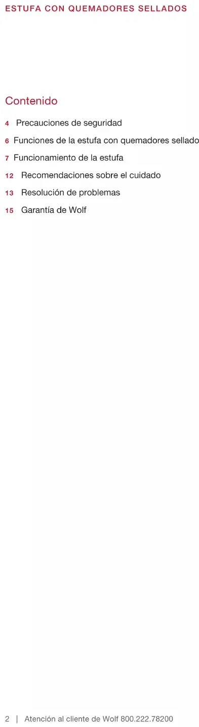 - No almacene materiales ignífugos cerca de los quemadores y tampoco permita la acumulación de grasa u otras sustancias ignífugas en este electro- doméstico.6 | Atención al cliente de Wolf 800.222.78200 Funciones de la estufa con quemadores sellados CARACTERÍSTICAS