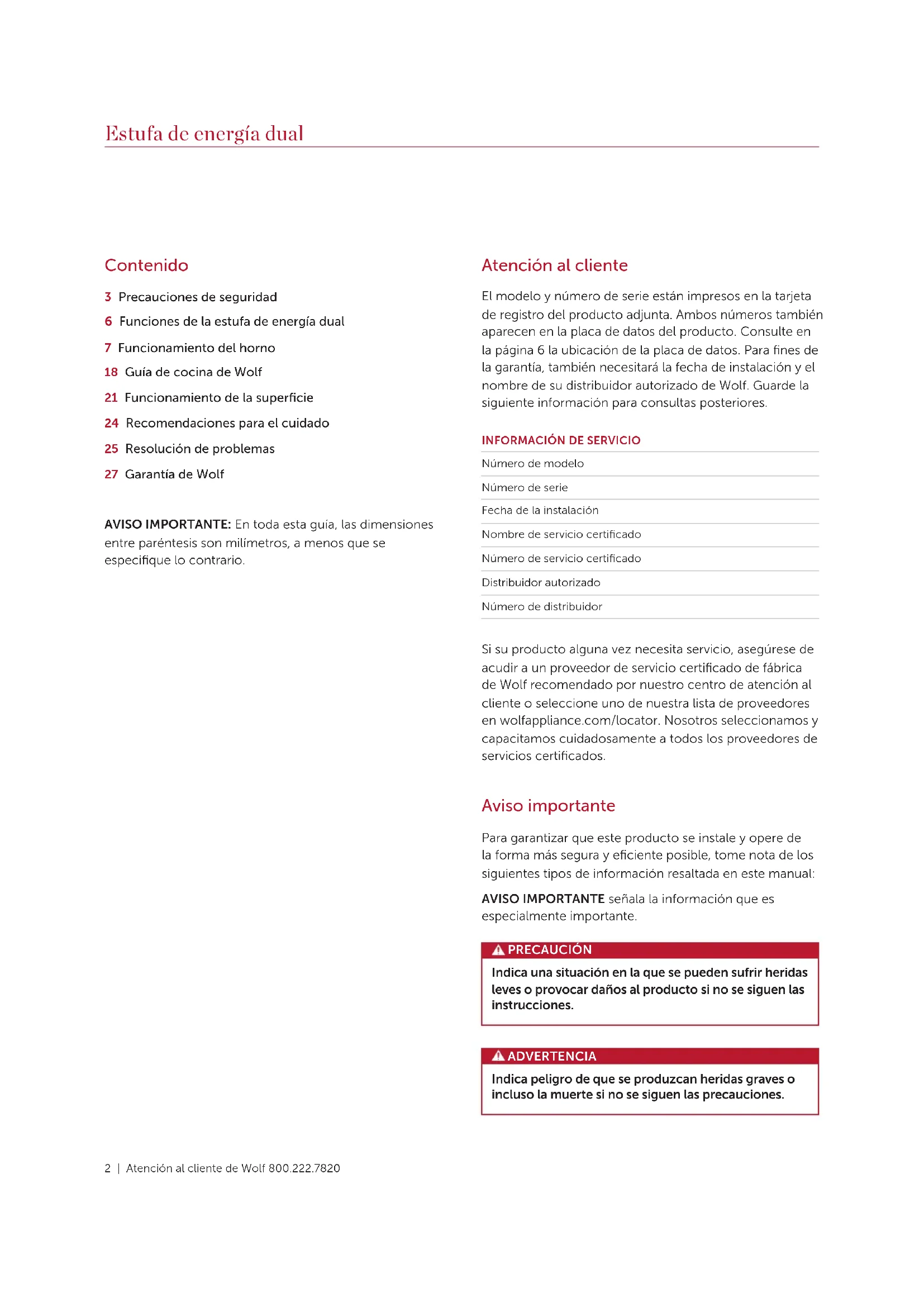 Primeros pasos Sabemos que no puede esperar para empezar a cocinar, pero antes de hacerlo, dedique un poco de tiempo a leer este manual de uso y cuidado. Si usted es un cocinero ocasional o un chef experto, se beneficiará de familiarizarse con las prácticas de seguridad, características, funcionamiento y recomendaciones de cuidado de su estufa de energía dual de Wolf.