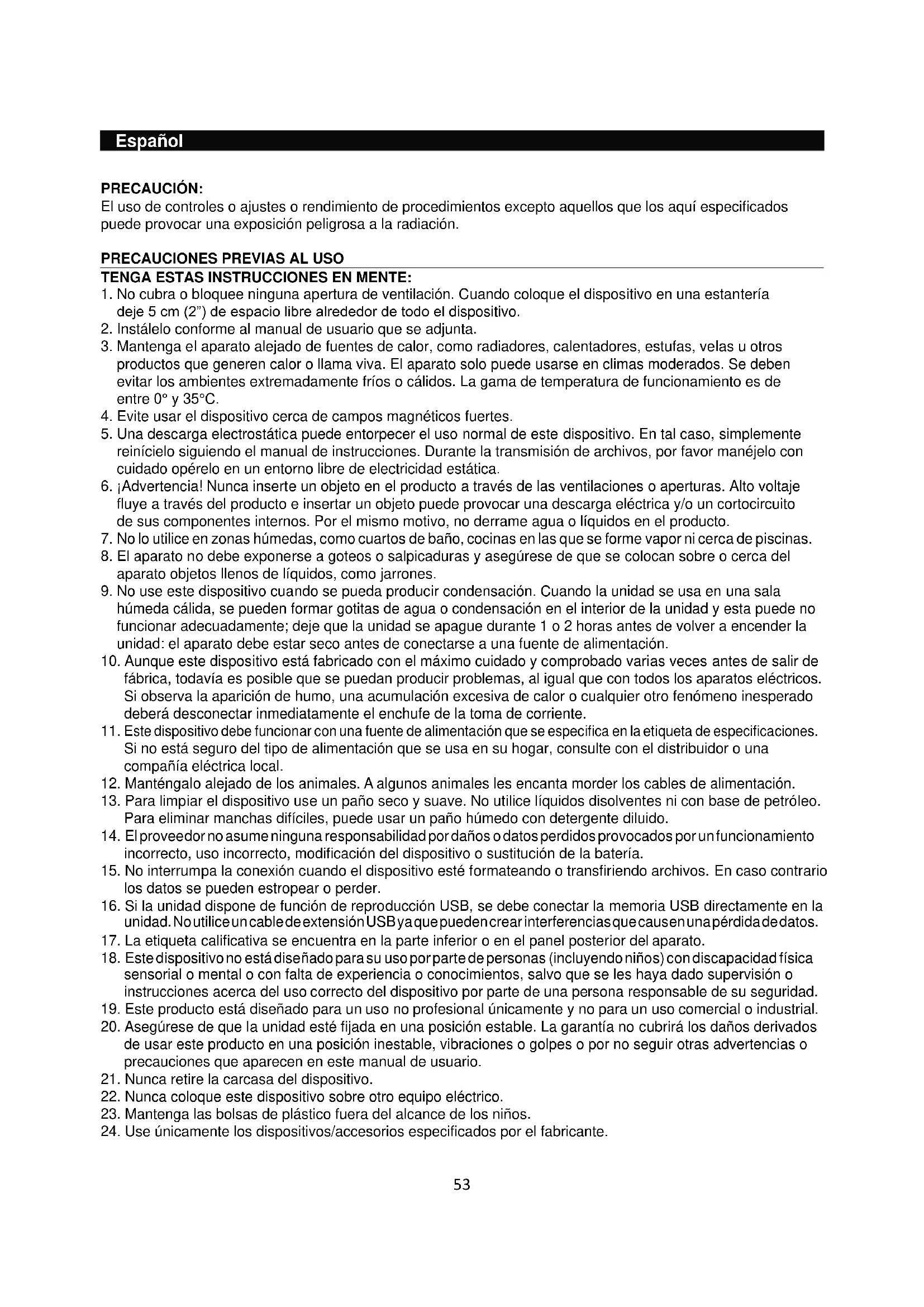22. Nunca coloque este dispositivo sobre otro equipo eléctrico.